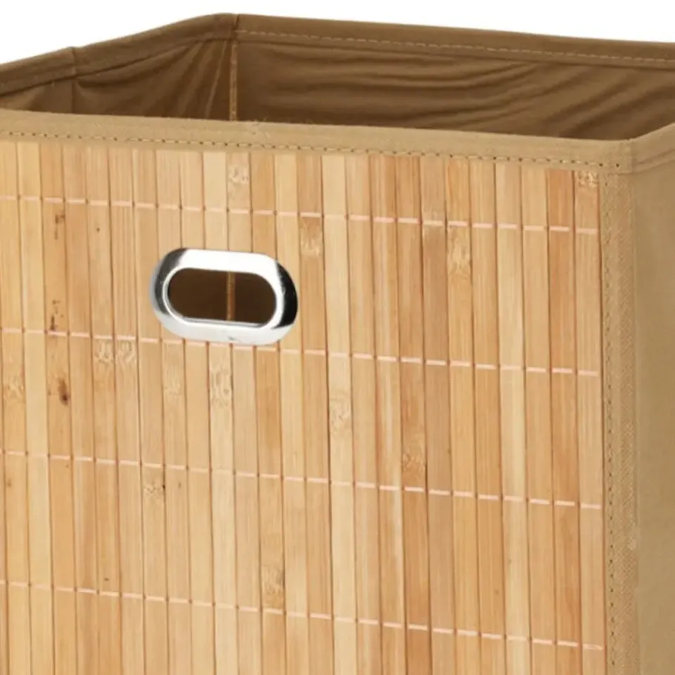 Opbergmand/kastmand/vakkenkast module mand in de kleur naturel met afmetingen 31 x 31 x 31 cm. De kast opbergbox/opbergmand heeft een inkeping aan de voorkant, voor makkelijk uit de kast pakken/schuiven. De zijwanden zijn verstevigd met 1.5 mm dik bamboe voor extra stabiliteit en daardoor zijn de manden zeer geschikt voor bijvoorbeeld in een kinderkamer of een vakkenkast. Wanneer u de mand niet nodig heeft kunt u deze gemakkelijk opvouwen en opbergen. Afmeting: ca. 31 x 31 x 31 cm. Inhoud: ca. 28 liter. Materiaal: bamboe/kunststof.