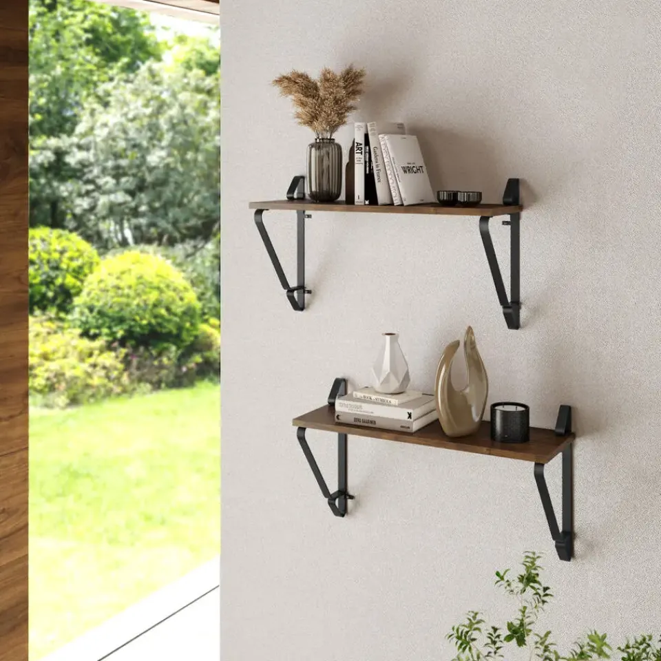 De eenvoudige set wandplanken Irvine van tectake overtuigen door hun slimme ruimtegebruik en charmante uitstraling. Door koel staal en warm hout te combineren, creëert dit duo een harmonieus contrast op je muren. De twee planken zijn ideaal voor het presenteren van kamerplanten, foto’s en andere favoriete items, evenals praktische opbergmogelijkheden voor boeken, cd’s, dvd’s of keukengerei. Door de goede veerkracht en grote weerstand tegen krassen en vuil zijn deze twee hangende planken van tectake niet alleen een stijlvol, maar ook een praktisch woonidee.