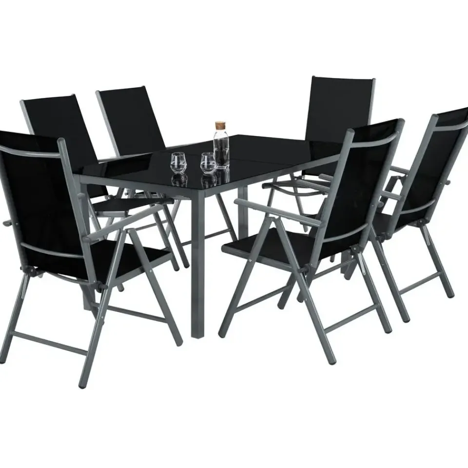 Met deze aluminium zitgroep maak je een uitstekende keuze. Tijdloos ontwerp en vele comfortabele functies – ideaal voor gezellige uurtjes met vrienden of familie in de tuin. Een hoogwaardige tafel met gepoedercoat aluminium frame en blad van veiligheidsglas garandeert een lange levensduur. De zes verstelbare, inklapbare stoelen hebben hoge rugleuningen voor meer comfort. Ook het frame is gemaakt van gepoedercoat aluminium, daardoor zijn de stoelen licht en kunnen ze in een handomdraai versteld worden. Een grote plus: de stoelen zijn inklapbaar en kunnen gemakkelijk en plaatsbesparend opgeborgen worden. De zitgroep zorgt voor een gezellige sfeer in je tuin. Let op: Montage vereist
