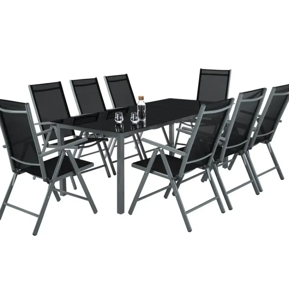 De duurzame aluminium zitgroep overtuigt door zijn moderne ontwerp en slimme functionaliteiten voor binnen en buiten! Een massieve tafel met esthetisch blad van veiligheidsglas en gepoedercoat aluminium frame biedt maximaal comfort en plaats voor al je visite. Daarbij horen 8 verstelbare, inkapbare stoelen van stabiel maar licht aluminium met een hoge rugleuningen voor meer zitcomfort. Superhandig: de stoelen zijn inklapbaar en kunnen in slechts enkele minuten ruimtebesparend worden opgeborgen . De zitgroep zorgt voor sfeer en gezelligheid in huis of in je tuin. Let op: Montage vereist