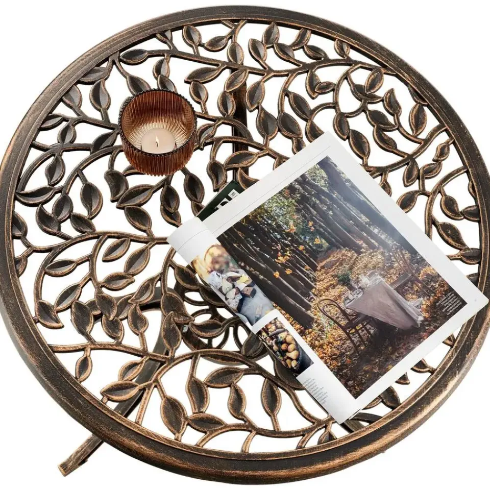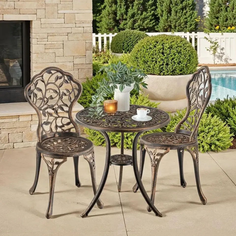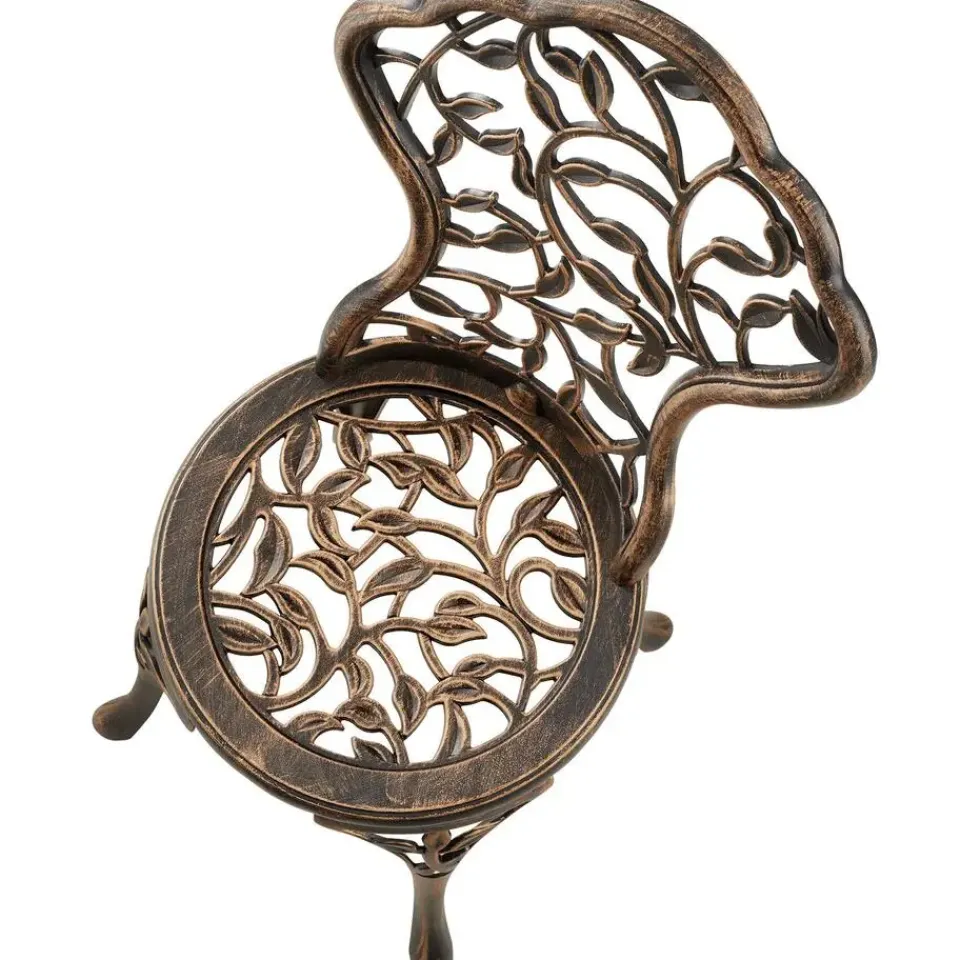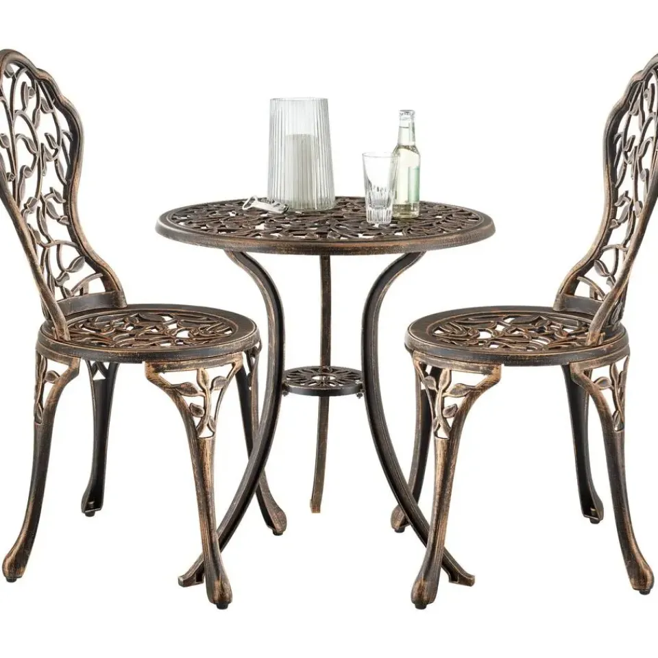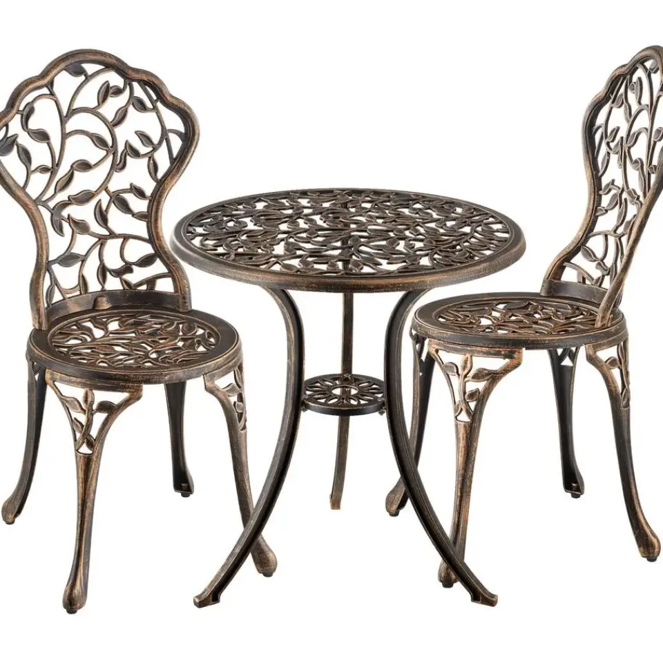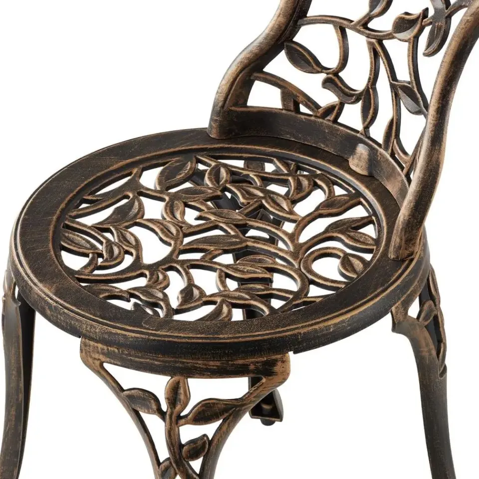 De stijlvolle bistroset Lyon van tectake betovert met zijn sierlijke vormen en kunstig vormgegeven bladornamenten, die in elke buitenruimte elegante accenten zetten.