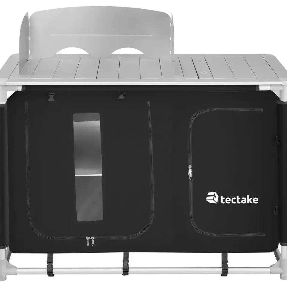 Het middelpunt van deze kookunit is het werkblad met een praktische windbescherming en een afdekbaar spoelbakje. Voor een goede ventilatie zijn de twee ruime opbergvakken aan de achterkant gedeeltelijk voorzien van mesh-stof. Het robuuste aluminium frame en de in hoogte verstelbare poten van de keukenbox zorgen voor een hoge stabiliteit. Gedemonteerd kan de lichte outdoor-keuken eenvoudig worden vervoerd in de meegeleverde draagtas. De functionele keuken voor onderweg: de campingkeuken van tectake.