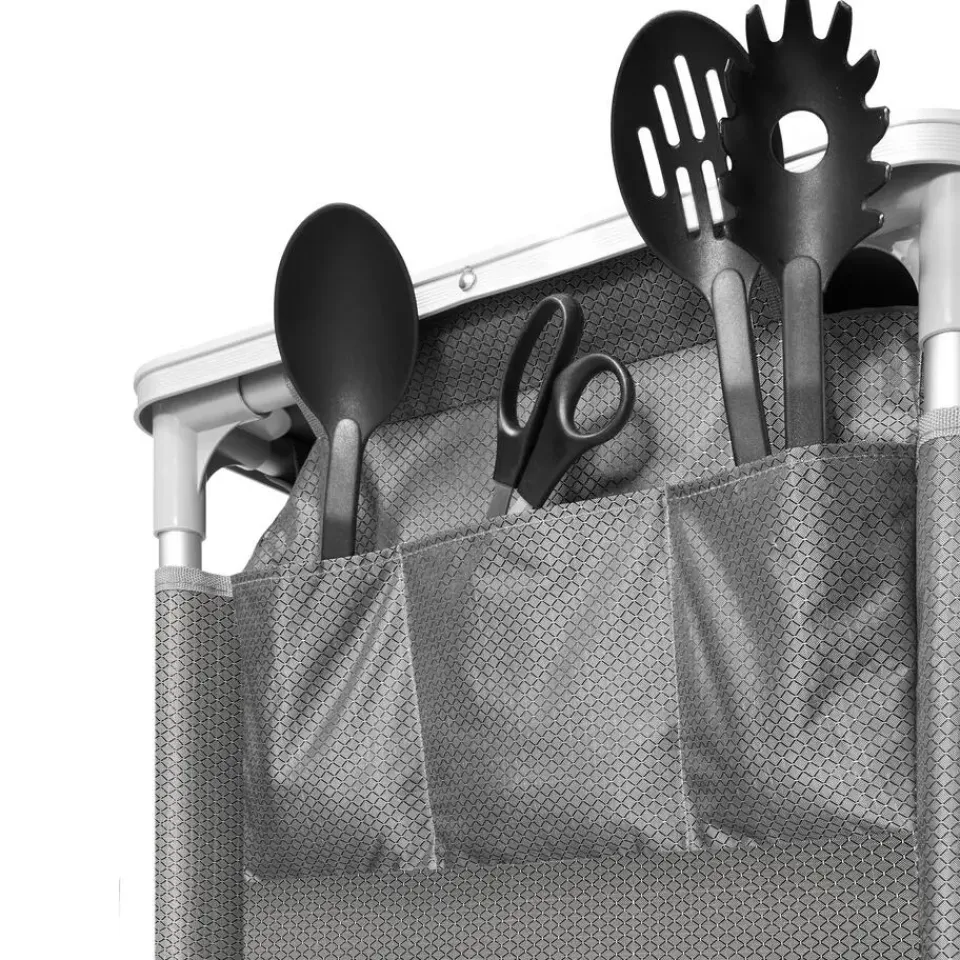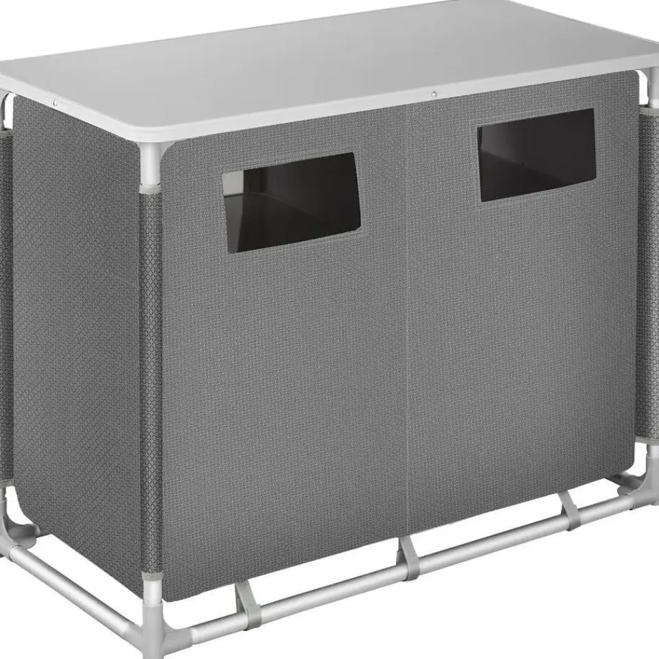 Grote opbergruimte met weinig plaatsbehoefte biedt deze praktische campingkast. De op- en afbouw is denkbaar eenvoudig en snel gedaan. De buitenkast is met een robuust werkvlak en zes grote vakken uitgerust. Voor voldoende luchtcirculatie zorgt de netstof op de rugzijde. De poten zijn apart verstelbaar zodat de kast op elke ondergrond stabiel staat. Met de ruime campingkast behoudt je als chef-kok ook in open lucht overzicht en orde.
