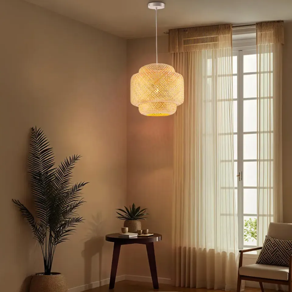 - Grote hanglamp met grote bamboe lampenkap in boho-stijl
