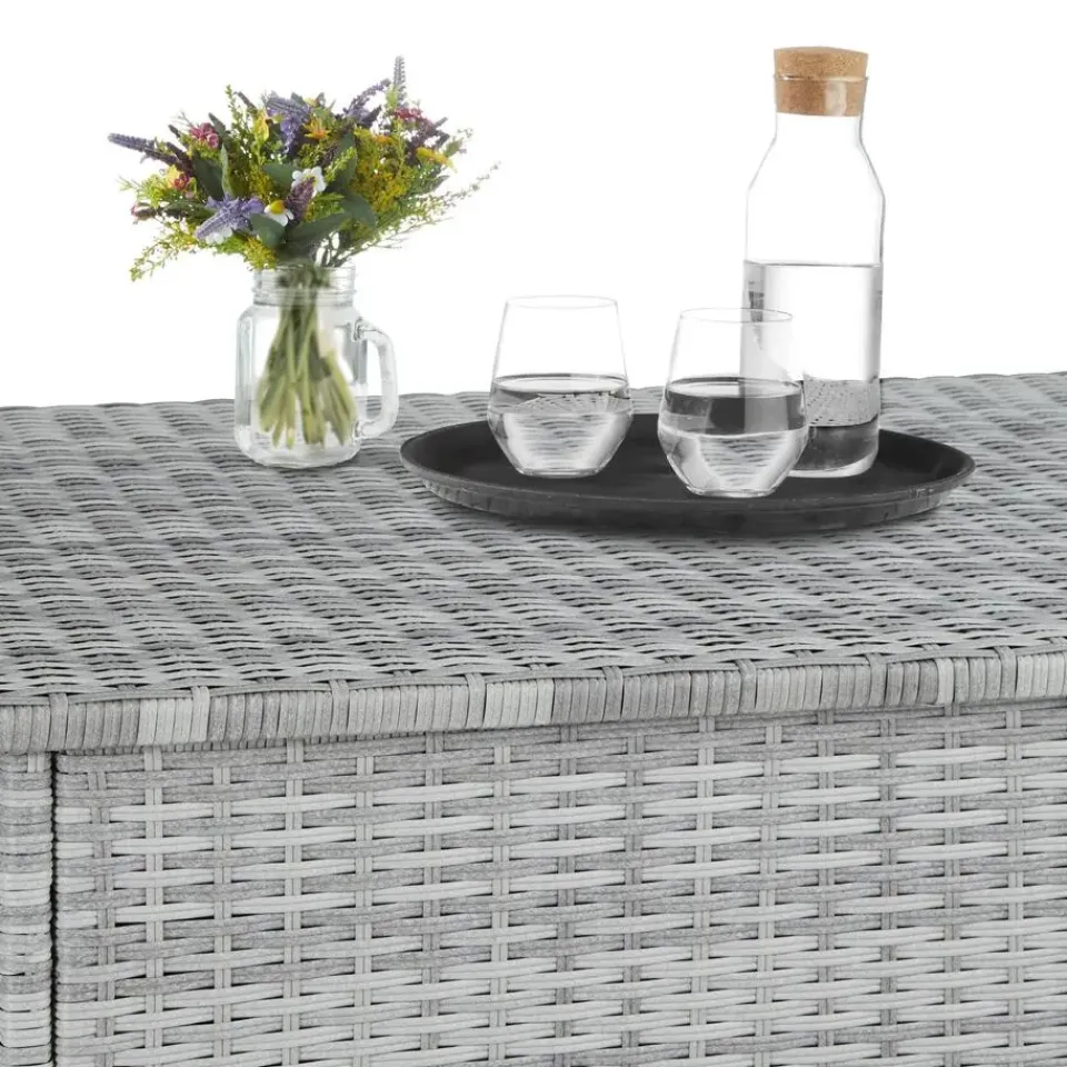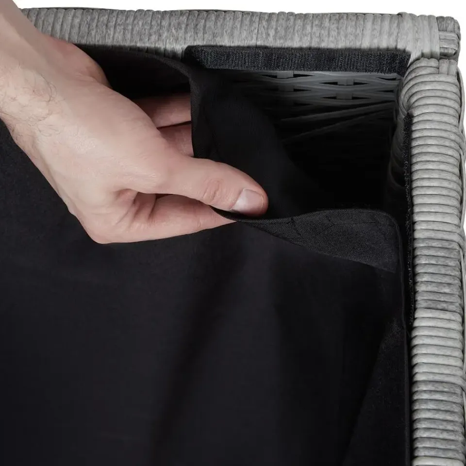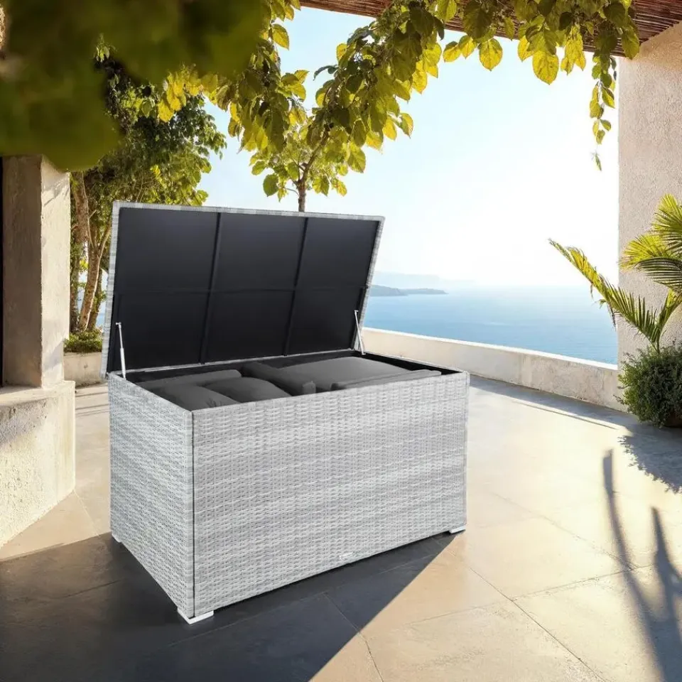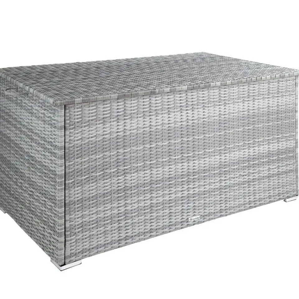 Deze ruime kussenbox biedt voldoende en goed beschermde opbergruimte voor kussens, speelgoed en alle soorten tuingereedschap. Het door dwarsbalken en inlegstuk verstevigde deksel overlapt de zijwanden en voorkomt zo ook het binnendringen van vocht. De beide gasdrukveren maken eenvoudig openen en sluiten mogelijk en voorkomen per ongeluk dichtklappen of opengaan door externe invloeden. Het fijne vlechtwerk van duurzaam wicker en het stabiele onderframe van aluminium maken deze roestvrije kussenbox perfect voor gebruik in open lucht. Let op: Montage vereist