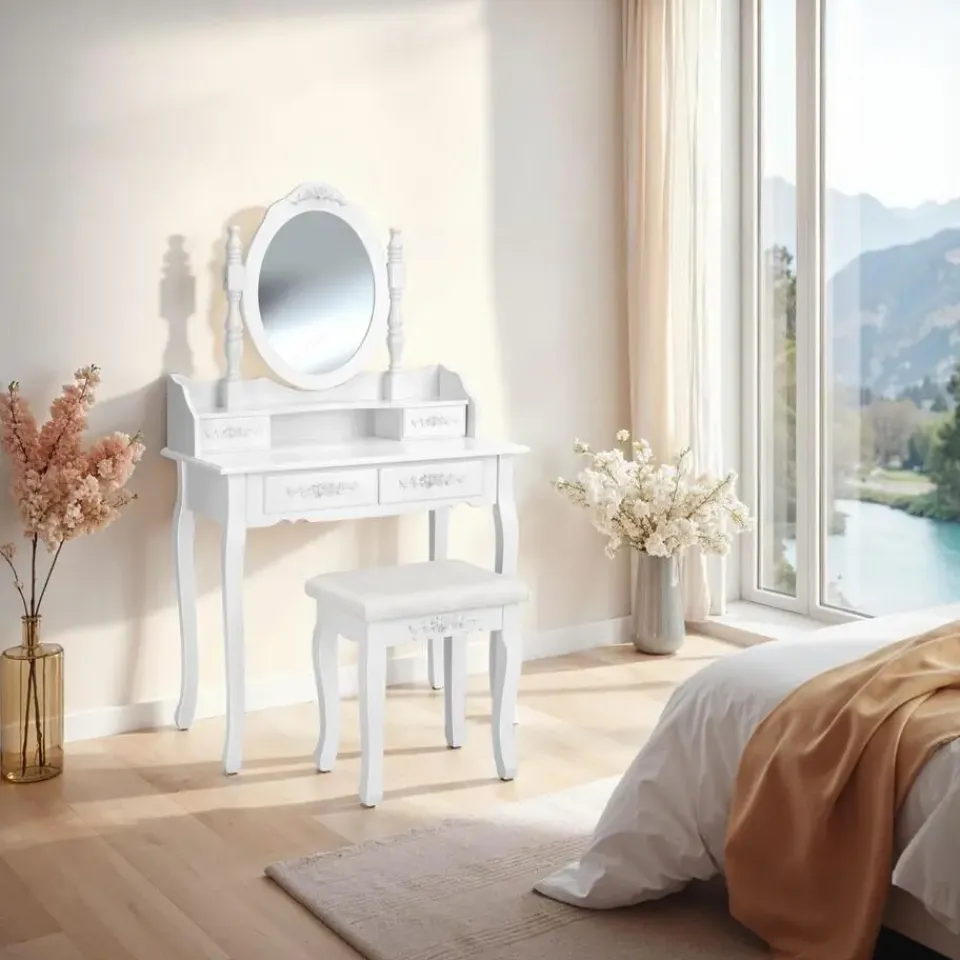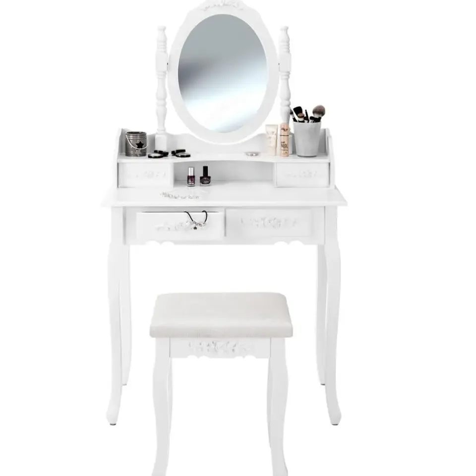 Deze elegante makeup-tafel is een echte aanwinst en kan op verschillende manieren worden gebruikt: als commode, als slaapkamertafel of voor het verzorgen van je makeup en kapsel. De vier ruime lades bieden extra ruimte voor al je sieraden en accessoires. De lades en de comfortabele zachte kruk zijn versierd met prachtige opvallende rozen. De afneembare draaiende ovalen spiegel maakt deze prachtige tafel compleet. De witte lakafwerking op de tafel en het krukje maakt één geheel van dit vlekkeloze duo.