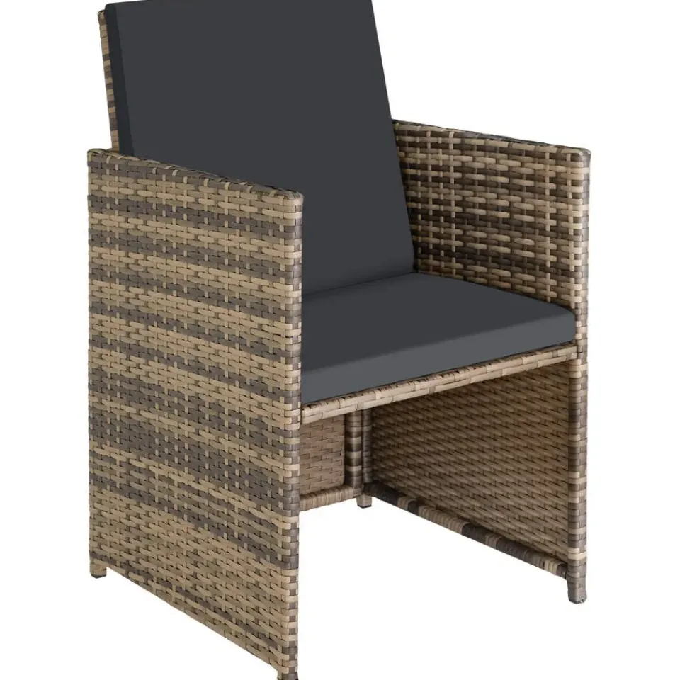 Wie van een opgeruimde tuin houdt, zal dol zijn op het uiterst praktische kubussysteem van onze wicker set. Dankzij de inklapbare rugleuningen kunnen de stoelen volledig onder de tafel worden geschoven en zo in een compacte, vierkante vorm worden opgeborgen. De uitsparingen aan de achterkant van de stoelen maken het verplaatsen gemakkelijk.