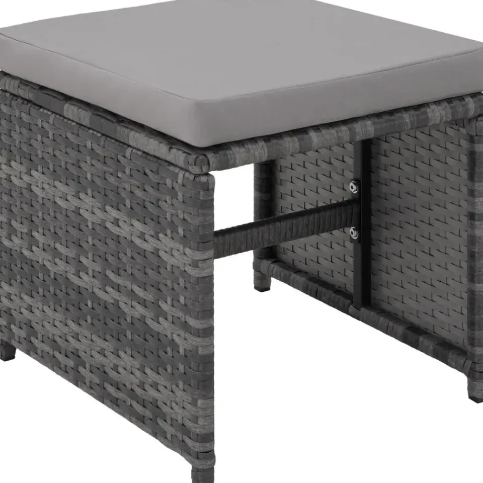 - Materiaal: zitgroep uit Polyethyleen, stalen gestel, roestvrijstalen schroeven, hoezen en kussens uit 100 % polyester