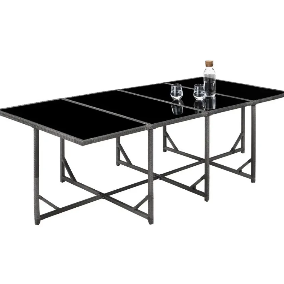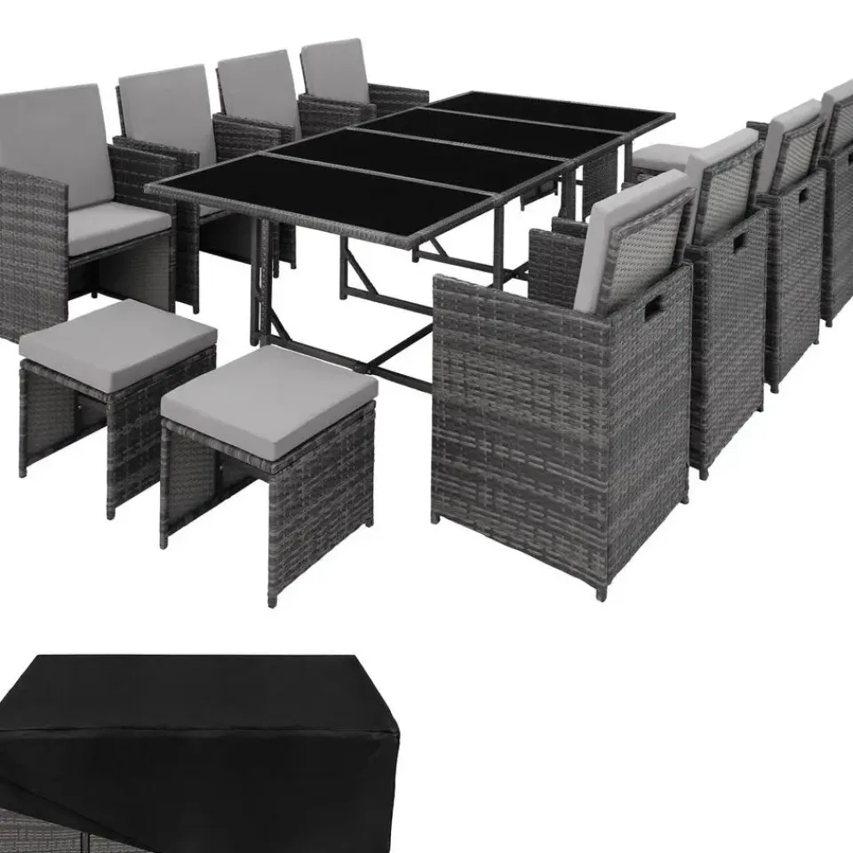 Alle hoezen van de zit- en rugkussens zijn afneembaar en waterafstotend, wat het reinigen en onderhouden aanzienlijk vergemakkelijkt. De vier gemakkelijk te reinigen veiligheidsglasplaten van de grote tafel bieden niet alleen een glanzend en modern uiterlijk, maar ook voldoende ruimte voor eten en drinken. In de levering is bovendien een bijpassende beschermhoes inbegrepen die de zitgroep beschermt tegen wind, zon, stof en andere externe invloeden wanneer deze niet in gebruik is.