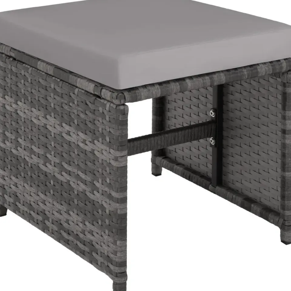 - Materiaal: Zitgroep is gemaakt van Polyethyleen, stalen gestel, roestvrijstalen schroeven, hoezen en kussens uit 100 % polyester