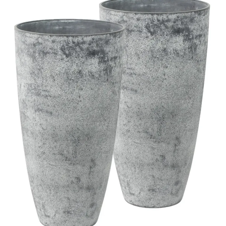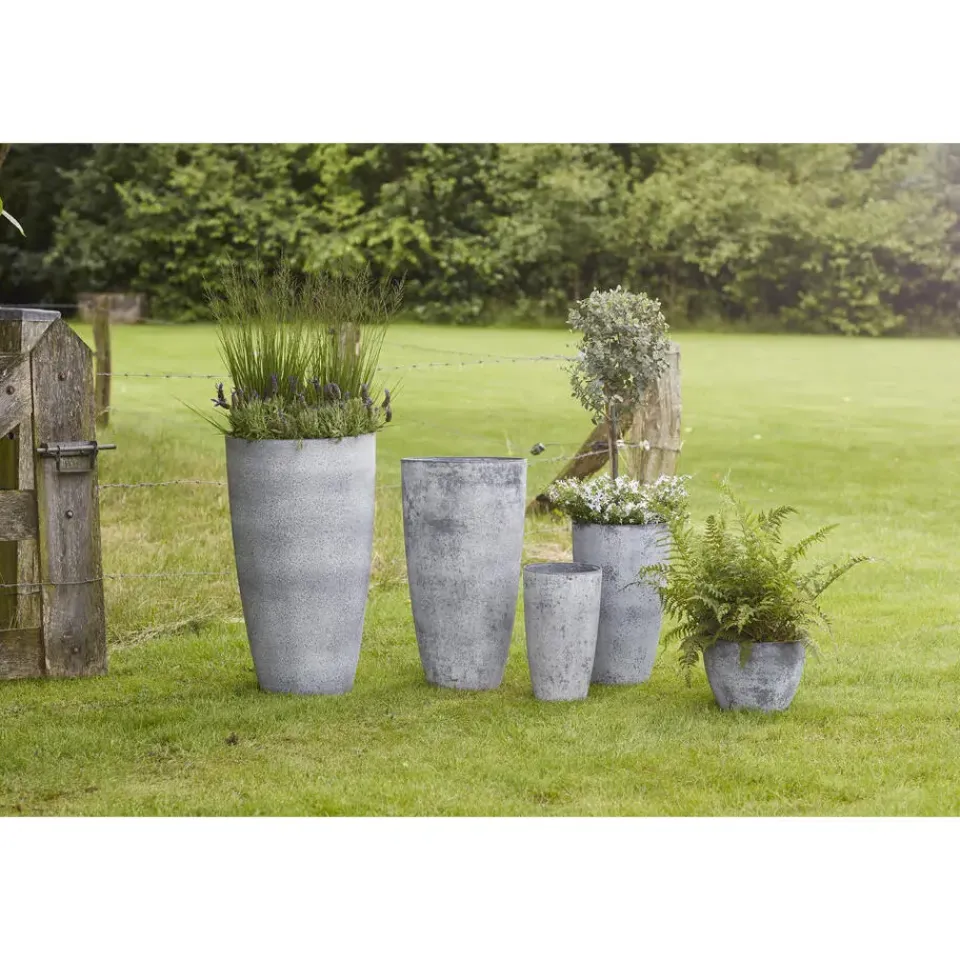 Hoge bloempot/plantenpot of vaas van gerecycled kunststof en steenpoeder in de kleur betongrijs met diameter 29 cm en hoogte 50 cm. Potten/vazen voor kamerplanten, buitenplanten, bloemen of kunstplanten. Deze bleoemenvaas/pot voor binnen en buiten heeft een stijlvolle uitstraling in elk interieur. Een unieke duurzame mix van materialen dat nu geen afval is, maar een prachtige duurzame bloempot. Een sterke, mooie pot die vriendelijk is voor het milieu en de portemonnee. De pot/vaas heeft gaatjes in de onderkant dus een opvangschaal is voor binnen gebruik vereist. Zoeknaam serie voor de schaal is Nova concrete grijs. Deze serie potten hebben een eigen drainagesysteem onderin de pot.