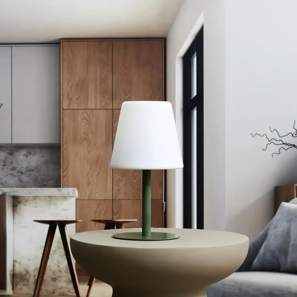 Home deco factory LED tafellamp. Deze stijlvolle LED tafellamp is een veelzijdige verlichtingsoplossing voor zowel binnen- als buitengebruik. Met een hoogte van 30 cm is dit een ideale tafellamp. De geintegreerde RGB-verlichting biedt een breed scala aan kleuren, waarmee je eenvoudig de gewenste sfeer creeert – van rustgevend wit tot levendige kleuraccenten. Dankzij het draadloze ontwerp en de weerbestendige behuizing is de lamp ideaal voor gebruik op bijvoorbeeld terrassen, balkons, tuinen of in woon- en slaapkamers. De voet van de lamp is groen.