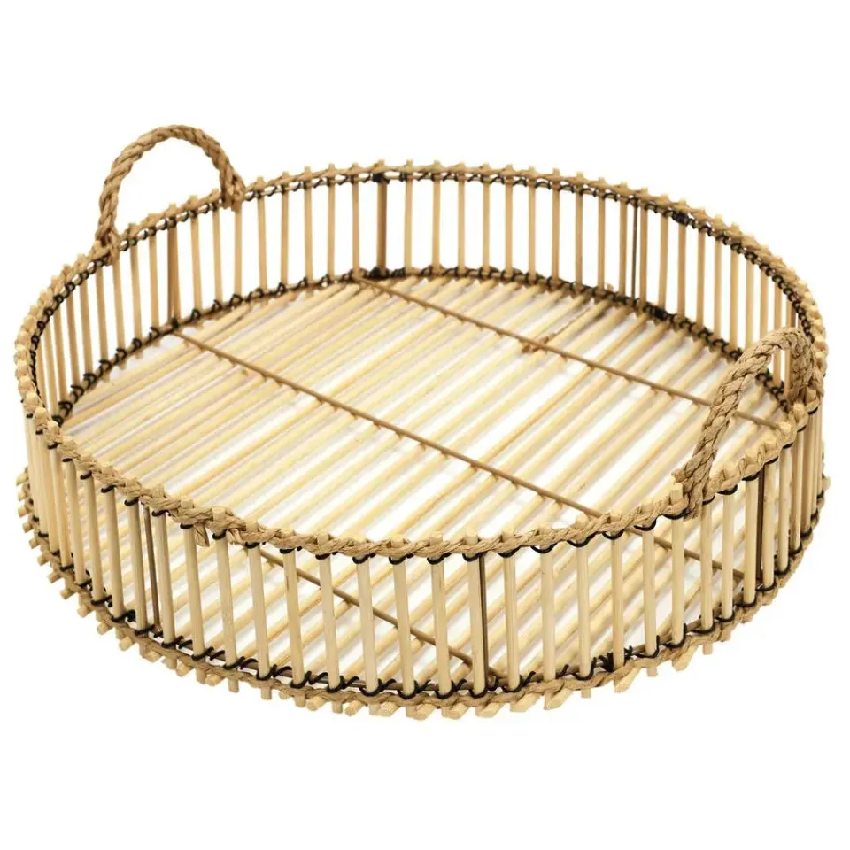 Rond Design serveer dienblad met opstaande rand voor glazen en kopjes. Materiaal: bamboe hout. Afmetingen: D40 x H6 cm. Gebruik het dienblad voor het serveren van koffie, thee, gebakjes, ontbijt, noem maar op. Deze karaktervolle, maar vooral ook handige ruime serveertray is overal voor te gebruiken. Kleur: naturel.