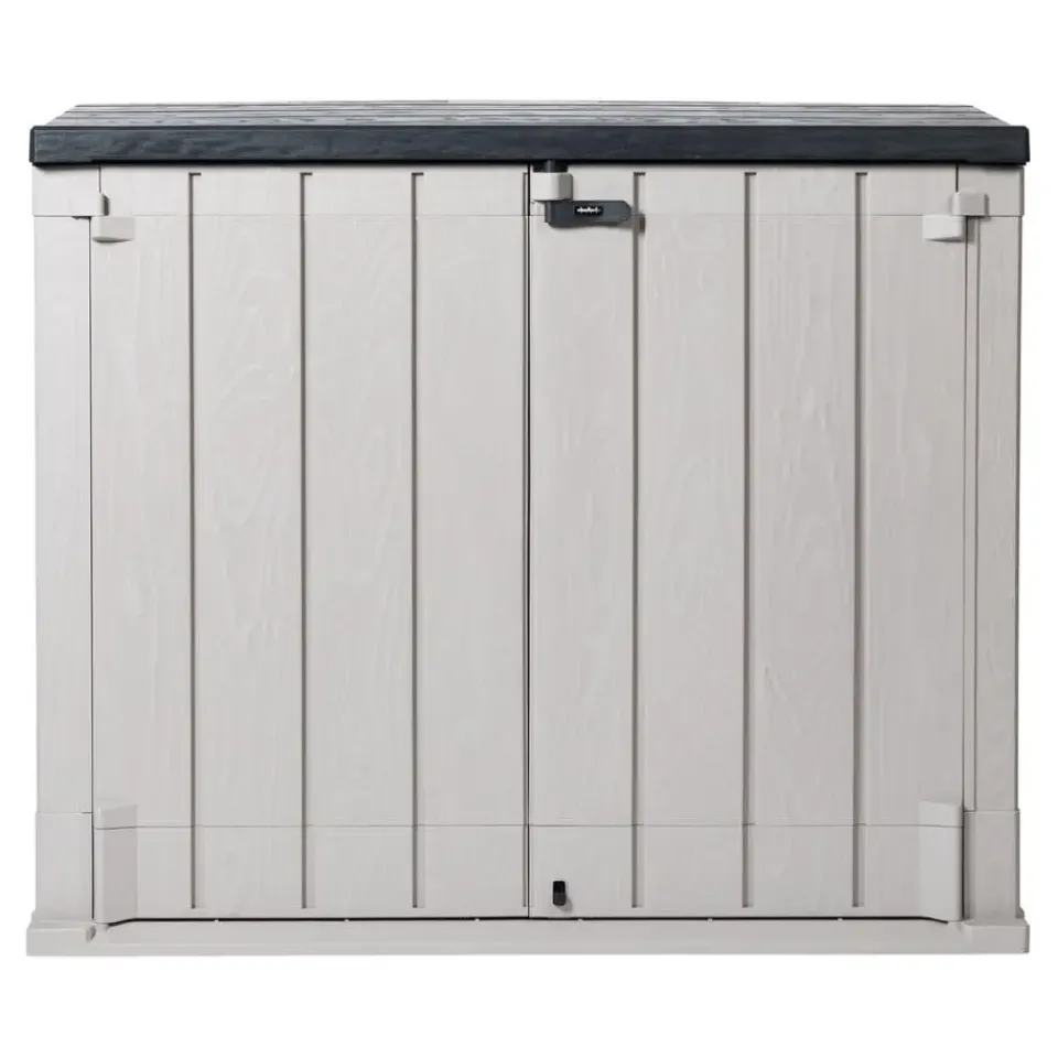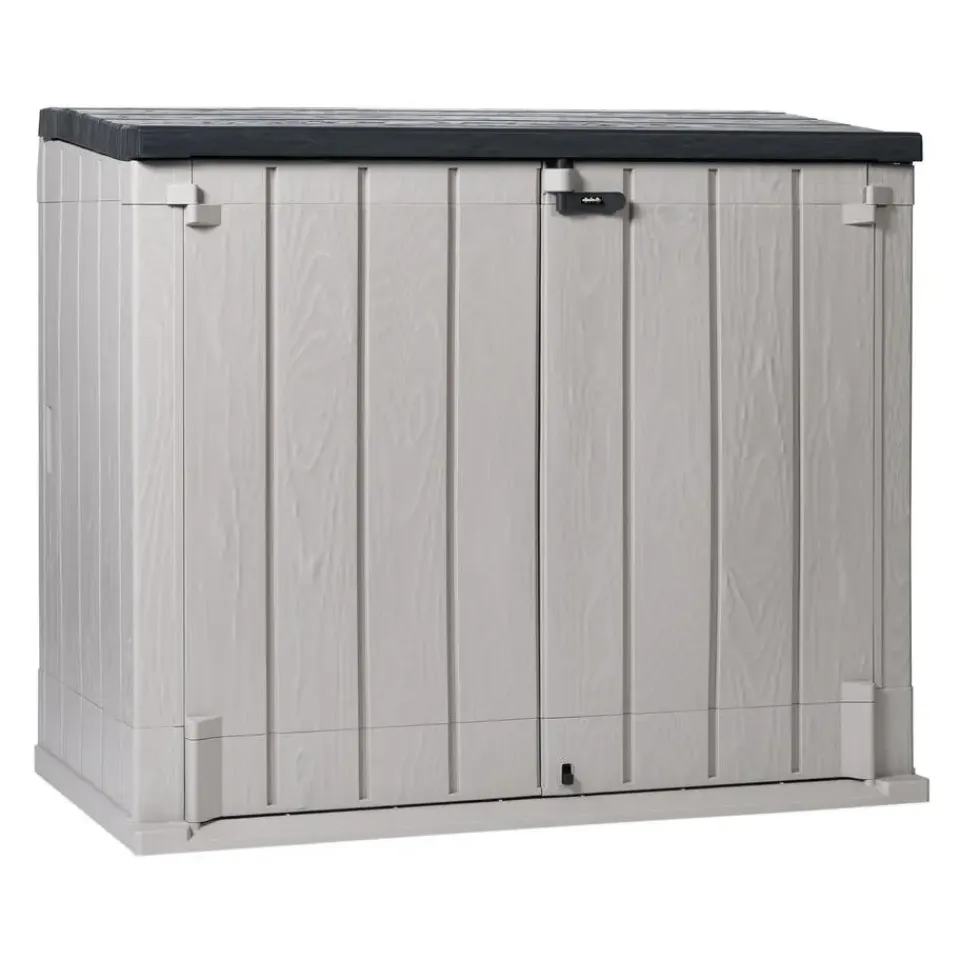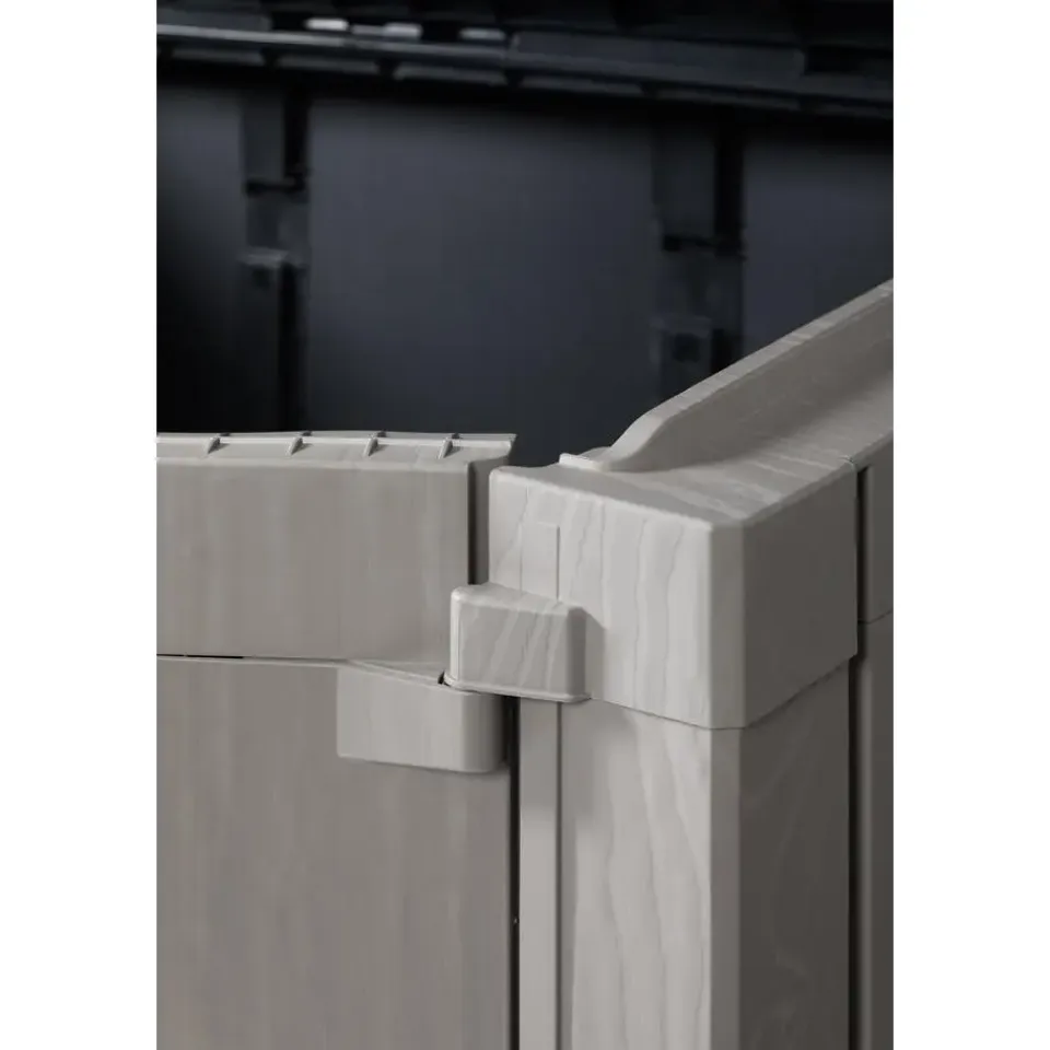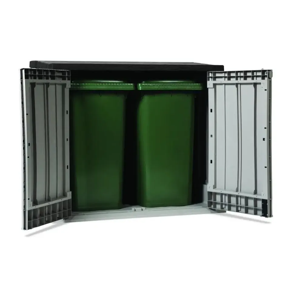 Toomax Stora Way opbergbox – 1270L – lichtgrijs/antracietDe Toomax Stora Way opbergbox is de perfecte oplossing voor het opbergen van kussens, tuinaccessoires en prullenbakken in je tuin of op je terras. Deze stijlvolle en functionele opbergbox biedt een combinatie van gebruiksgemak, duurzaamheid en een aantrekkelijk ontwerp. Deze box kan open via de twee deurtjes maar ook door de klapdeksel. Door het grote volume is er genoeg plek voor het opbergen van tuinkussens of verschillende soorten tuingereedschap, maar ook voor twee 240L containers. De opbergbox beschikt over een hangslotvoorziening zodat je de box volledig kan afsluiten. (hangslot niet meegeleverd).