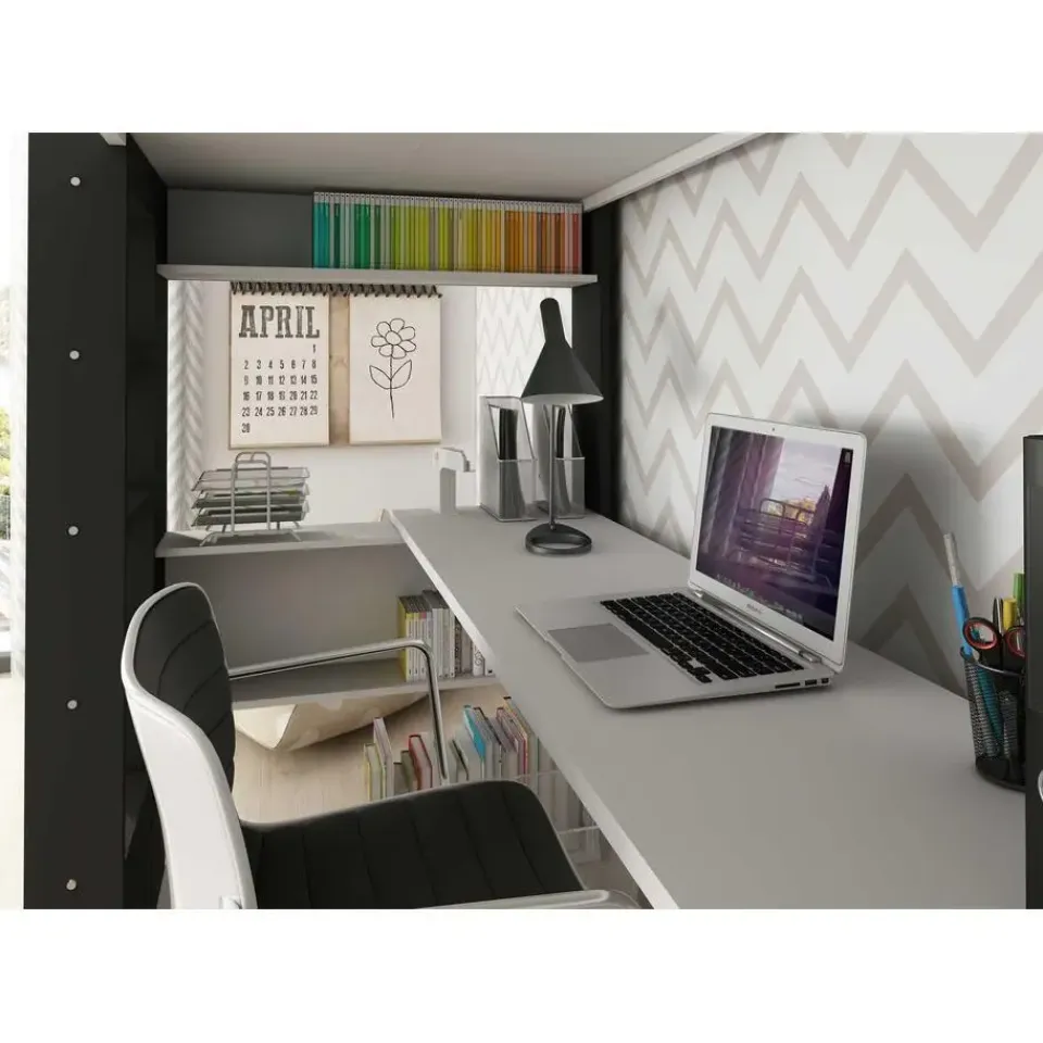 Deze hoogslaper met bureau is gemaakt van spaanplaat en werd afgewerkt in hoogwaardig melamine. De grafietgrijze accenten geven het geheel een contrastieve toets. Dit bed is ook beschikbaar in andere kleurencombinaties. Ontdek ze snel allemaal op onze site!