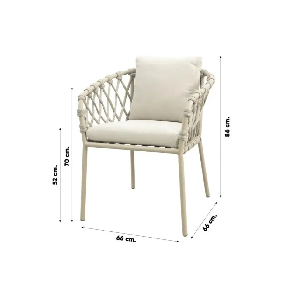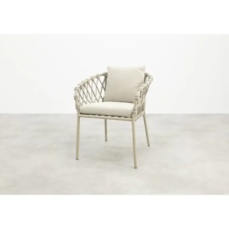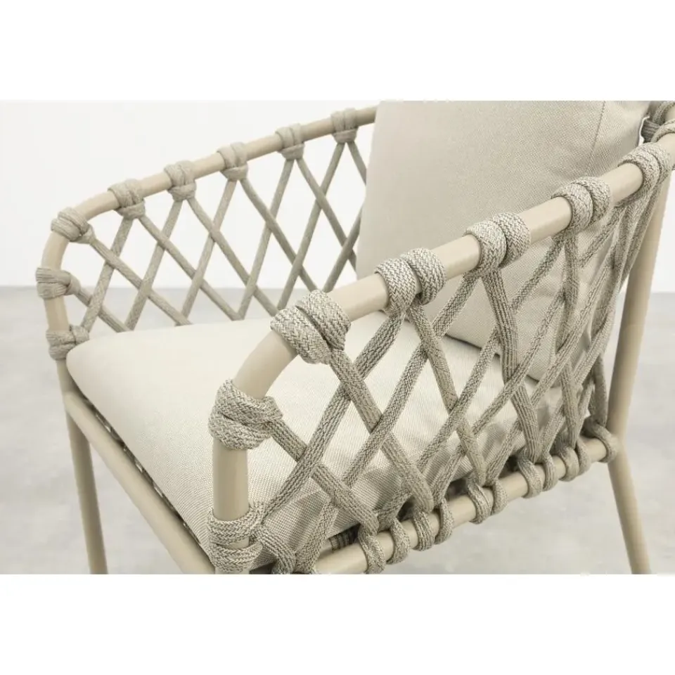 De Sara stoel is licht van gewicht, stevig en gemaakt voor buiten. Het aluminium frame in latte geeft een zachte, moderne uitstraling die makkelijk te combineren is met andere tuinmeubels. Het touwwerk (rope) in zandkleur zorgt voor een speelse, luchtige look, en de dikke kussens bieden top zitcomfort. Alles bij elkaar: een stijlvolle én praktische keuze voor wie graag buiten geniet in stijl.