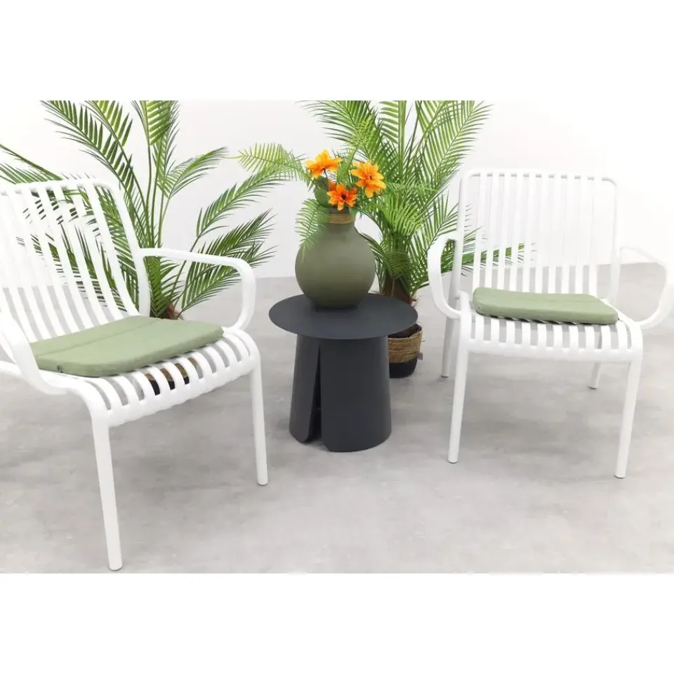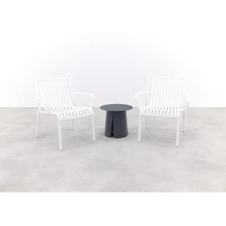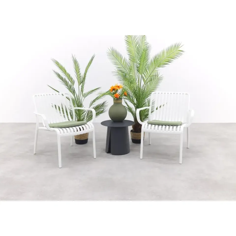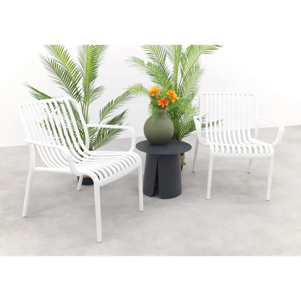 Geef je tuin of balkon een frisse en stijlvolle look met de Stripe loungestoelen in wit en de Velora koffietafel! De witte loungestoelen bieden heerlijk zitcomfort en vallen op door het moderne, open design met subtiele strepen. De Velora koffietafel Ø45 cm, met zijn lichte aluminium en unieke split-onderstel, voegt een stoer en eigentijds accent toe aan je buitenruimte. Deze compacte set is ideaal voor kleine hoekjes en brengt direct sfeer en gezelligheid.