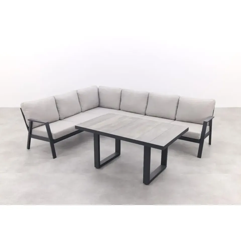 De Viento hoekbank en Darwin loungetafel vormen samen een fijne en praktische loungeset voor je tuin of terras. De ruime hoekbank biedt plek aan 5 tot 6 personen, perfect om samen te genieten van een drankje of te relaxen in de zon. Dankzij de hogere Darwin loungetafel is deze set ook ideaal voor lounge dining – ontspannen eten en drinken op een comfortabele hoogte. Het krasvaste keramieken blad en stevige aluminium frame maken de tafel makkelijk in onderhoud en voegen een moderne, stoere uitstraling toe aan je buitenruimte.