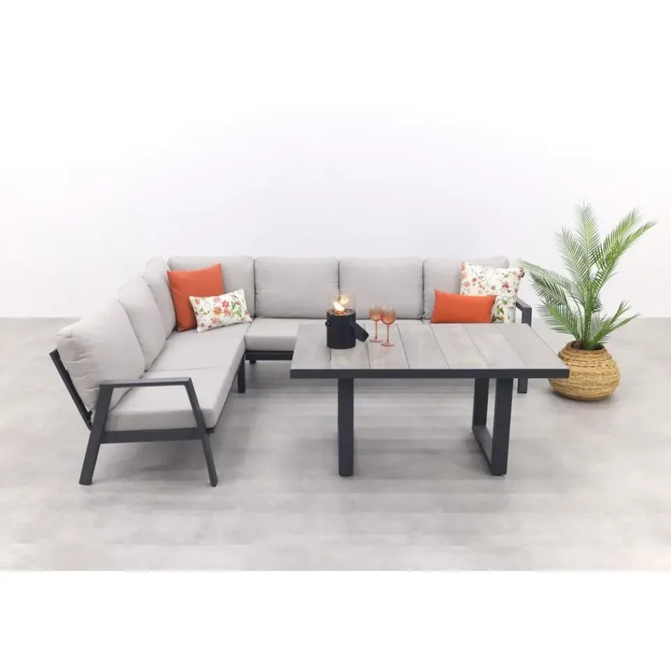 De Viento hoekbank in Royal Grey is perfect voor een gezellige zithoek buiten. De bank biedt plek aan 5 tot 6 personen en heeft een stevig aluminium frame met een kras- en stootvaste coating in antracietkleur. De zachte kussens zorgen voor veel comfort en hebben afritsbare hoezen die je makkelijk kunt wassen. Zo blijft de bank er altijd netjes uitzien. Met zijn moderne uitstraling en onderhoudsvriendelijke materialen is deze hoekbank ideaal voor ontspannen momenten in je tuin of op je terras!