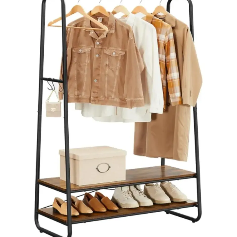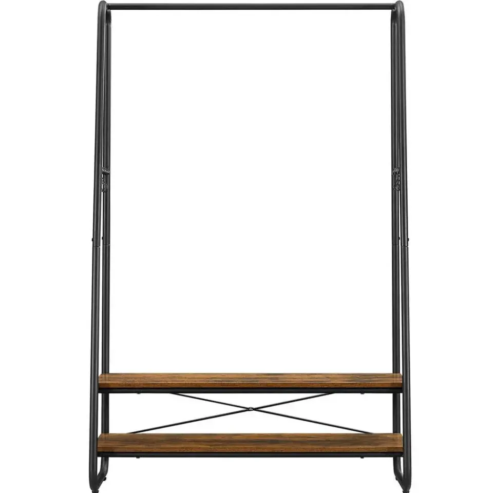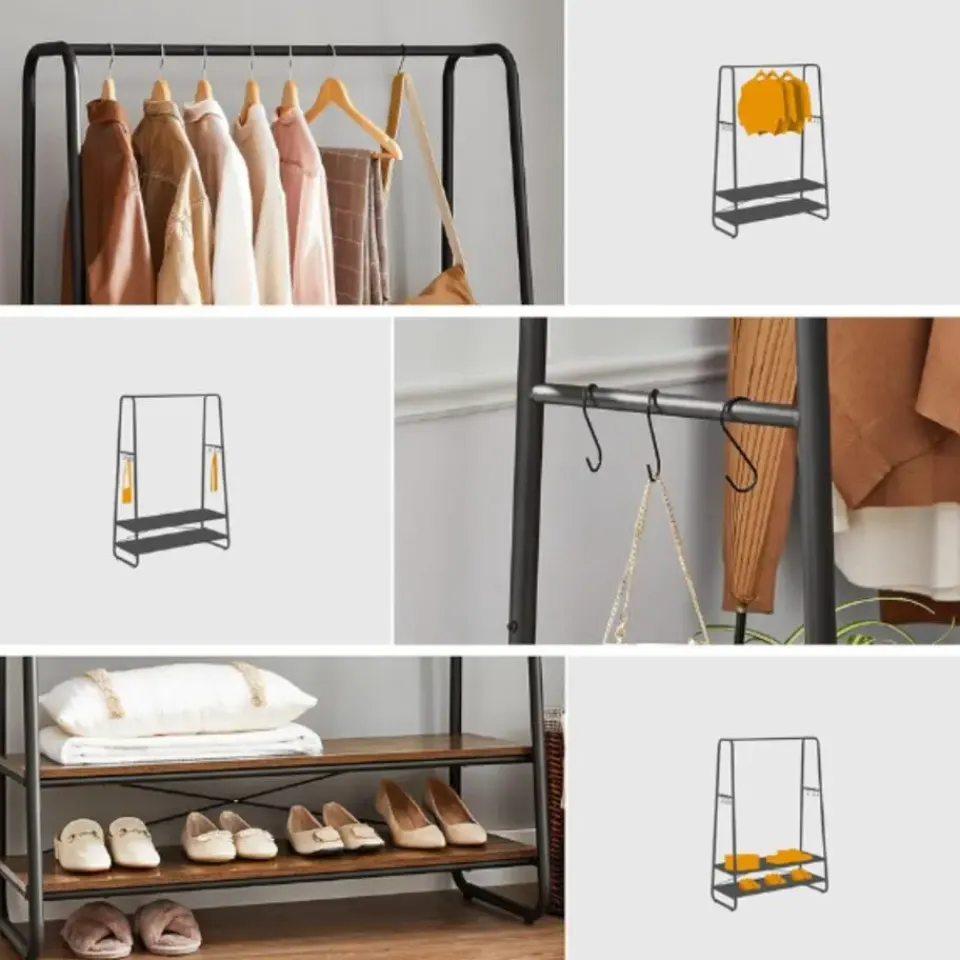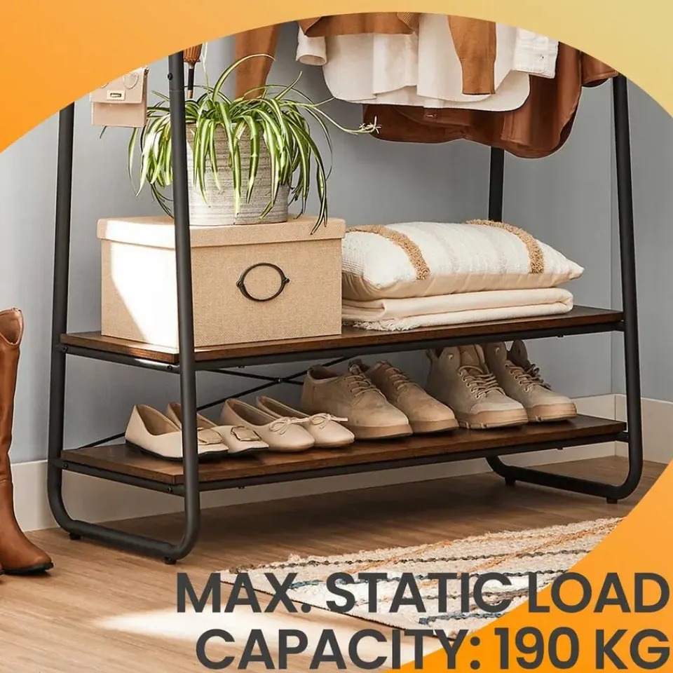 Belangrijkste kenmerken:Deze kledingroede, heavy-duty kledingrek met 2 planken, 6 S-haken en stalen frame is perfect voor gebruik in slaapkamers, ingangen of industriële ruimtes. Het helpt om uw ruimte georganiseerd en vrij van rommel te houden met veel opslagruimte voor kleding, tassen, schoenen, hoeden, sjaals, paraplu’s en nog veel meer.Het frame van de kledingroede is gemaakt van robuust, heavy-duty staal, terwijl de twee opslagplanken zijn gemaakt van duurzaam spaanplaat – sterk genoeg om tot 200 kg te houden. De ophangrail is ontworpen voor maximaal 30 kg aan hangende items zoals jassen, overhemden, broeken en meer. De 6 s-haken hebben elk een maximaal statisch draagvermogen van 5 kg en een totale capaciteit van 30 kg, zodat je je accessoires en kleinere items kunt ophangen.Deze kledingroede is eenvoudig in elkaar te zetten en wordt geleverd met genummerde onderdelen en een set instructies, zodat je hem gemakkelijk in elkaar kunt zetten. Het rustieke bruine en zwarte kleurenpalet geeft je ruimte een industriële uitstraling.BELANGRIJKSTE VOORDELEN:Deze kledingroede is niet alleen perfect om extra opbergruimte aan je huis toe te voegen, maar geeft je ook de vrijheid om je kleding in het zicht uit te stallen. Het stevige stalen frame en de planken van spaanplaat maken hem sterk genoeg voor veel kleding. De 6 s-haken maken het makkelijk om je accessoires op te hangen en het rustieke bruine en zwarte kleurenpalet geeft je ruimte een industriële uitstraling. Bovendien is hij eenvoudig in elkaar te zetten met makkelijk te volgen instructies en genummerde onderdelen. Met een maximale totale statische belasting van 200 kg is het de perfecte opberghulp voor al je kleding en accessoires.