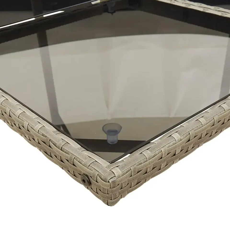 - Glazen tafelblad: het blad van de tuintafel is gemaakt van sterk en duurzaam gehard glas, waardoor het gemakkelijk schoon te maken is met een vochtige doek. Het voegt ook een vleugje elegantie toe aan je buitenruimte.