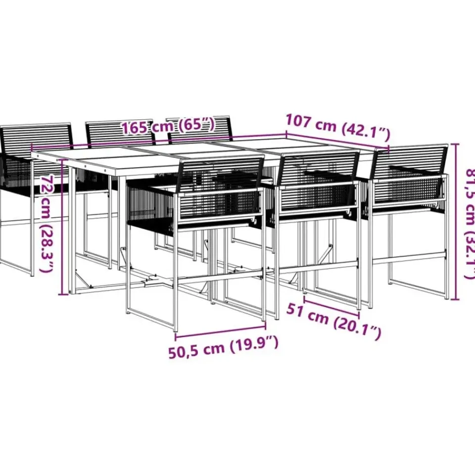 - Afmetingen tafel: 165 x 107 x 72 cm (L x B x H)