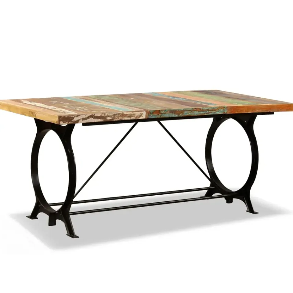 Deze eettafel is gemaakt van massief gerecycled hout, wat betekent dat het de kenmerken heeft van verschillende houtsoorten, zoals teakhout, mangohout en acacia. Hergebruikt hout is stevig, stabiel, duurzaam en mooi. Tekenen van slijtage en het vakmanschap geven elke tafel een unieke uitstraling en dragen bij aan de spectaculaire vintage stijl. Hij is volledig handgemaakt en elke stap van het productieproces wordt met de grootste zorg uitgevoerd, of het nu gaat om polijsten, verven of lakken. De stalen poten maken de industriële uitstraling af, samen met het stalen frame dat bijdraagt aan de stevige constructie.