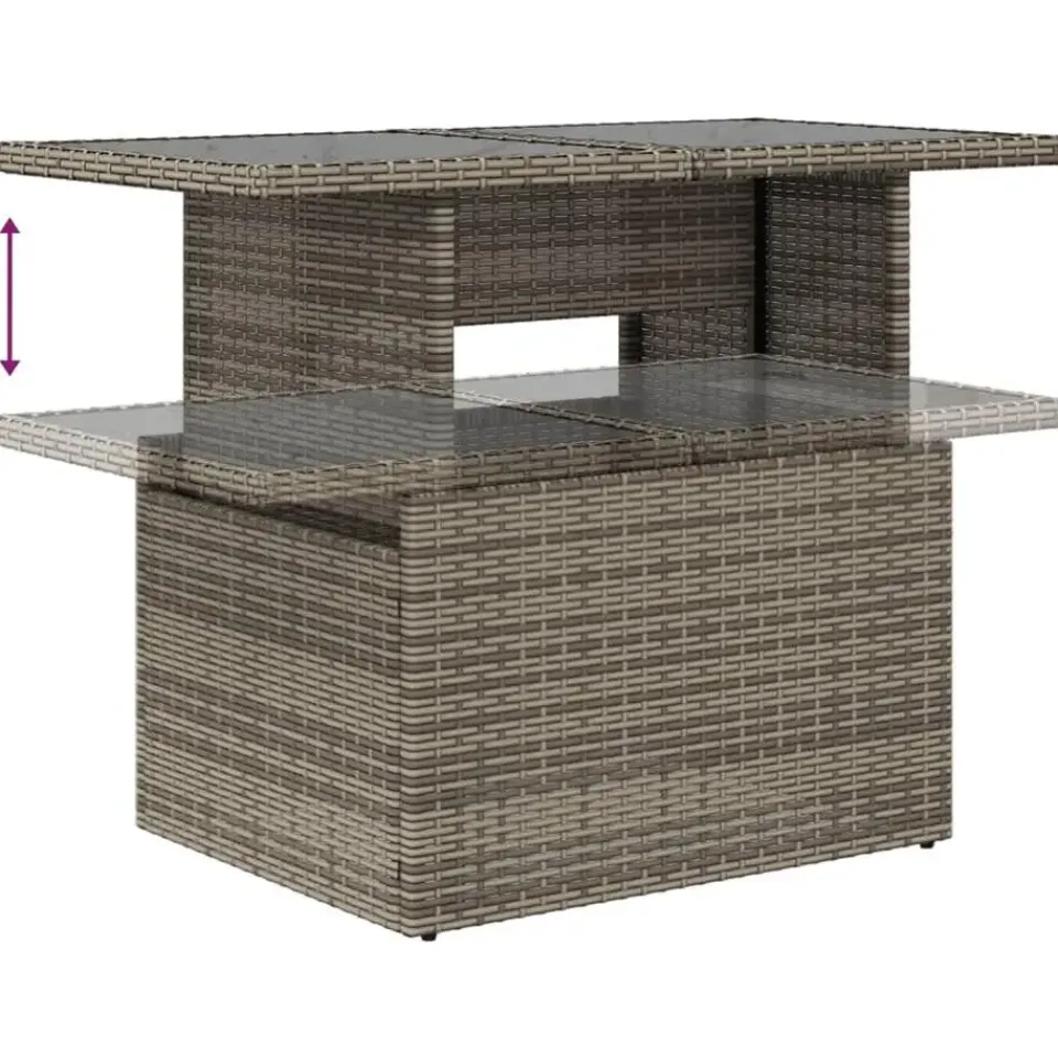 - Verstelbaar tafelblad: het tafelblad kan worden opgetild om de tafel hoger te maken, waardoor de tuintafel verandert van salontafel in eettafel. Hij is perfect om gasten te ontvangen of buiten te eten.
