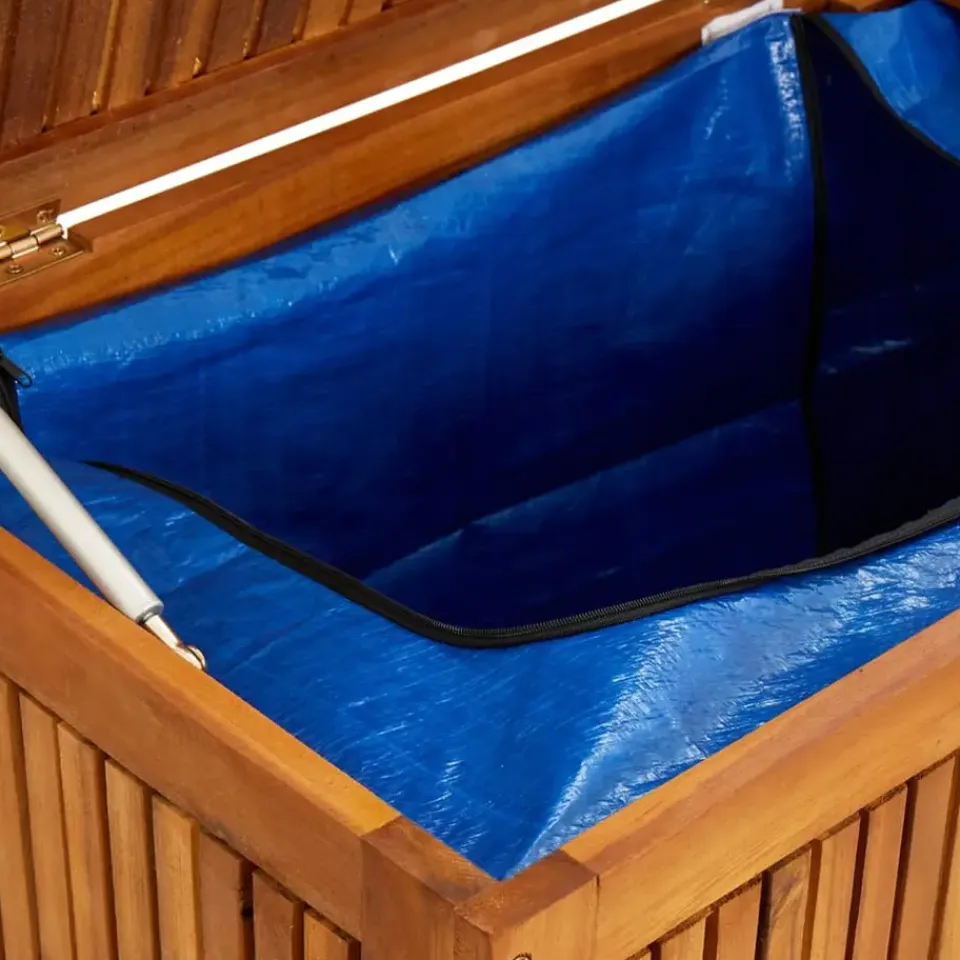 De opbergkist voor kussens is gemaakt van massief acaciahout met een olieafwerking en heeft een waterbestendige zak met een rits aan de binnenkant. Hierdoor is hij slijtvast, zeer duurzaam en uiterst geschikt voor buitengebruik. Hij biedt ook een ideale opbergoplossing voor kussens, dekens of andere huis- of tuinartikelen die je binnen handbereik en netjes georganiseerd wil hebben.