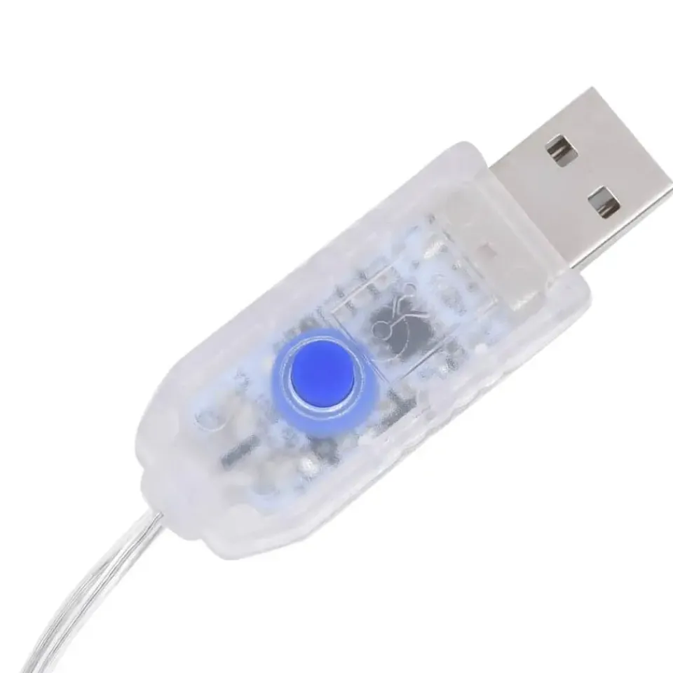 Opmerking: dit product heeft een USB-aansluiting, maar de 5 V USB-adapter is niet inbegrepen. Let op: de inbegrepen USB is niet waterdicht, dus dit onderdeel moet uit de buurt van water worden gehouden. Dankzij de 5 m lange verlengkabel kan de decoratie toch buiten worden gebruikt, aangezien de kabel en het product wel waterdicht zijn.