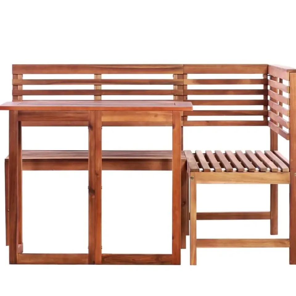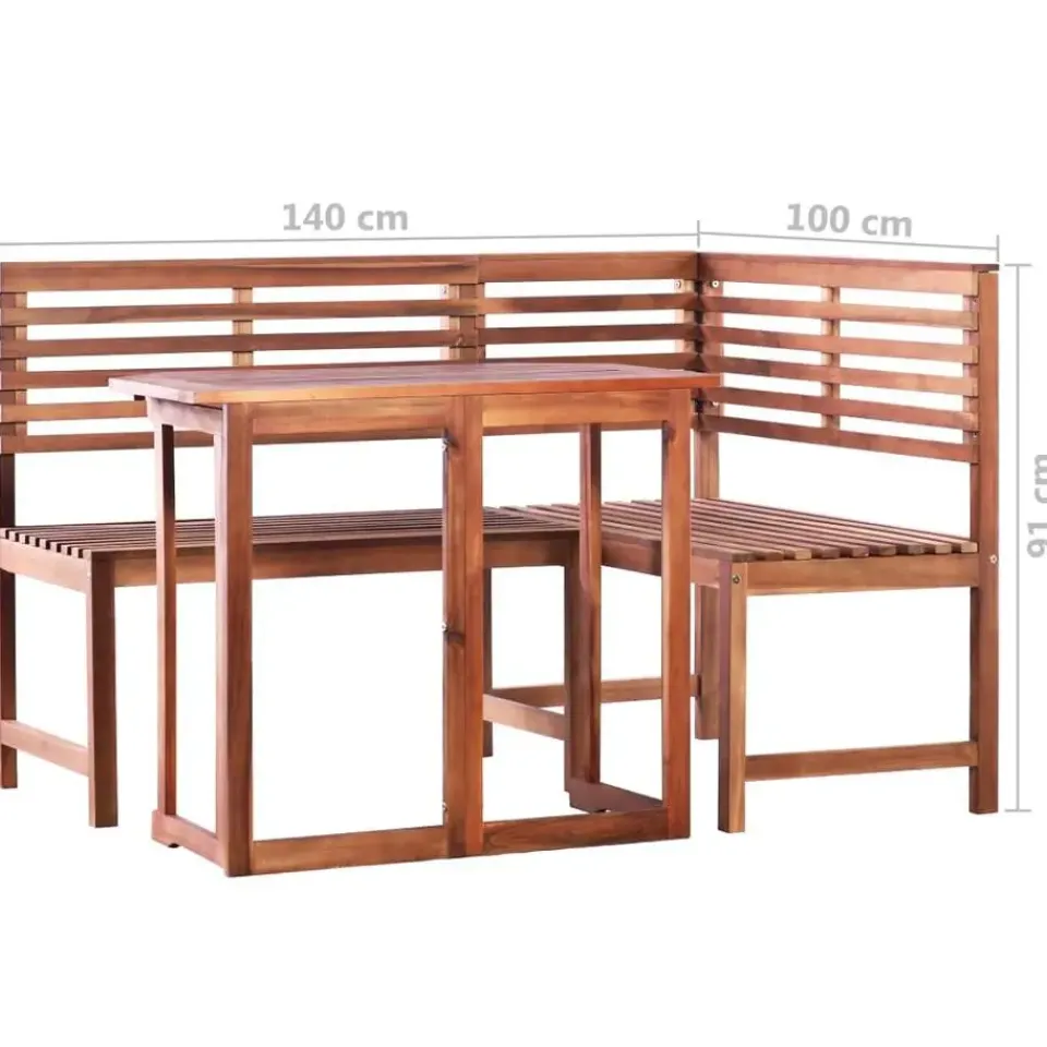 De tafel en de hoekbank zijn gemaakt van hoogwaardig acaciahout, een tropisch hardhout dat weerbestendig en zeer duurzaam is, en geschikt is voor buitengebruik. Het met olie afgewerkte oppervlak is eenvoudig schoon te maken met een vochtige doek. De tafel is inklapbaar voor eenvoudige opslag en transport. De set is eenvoudig te monteren.