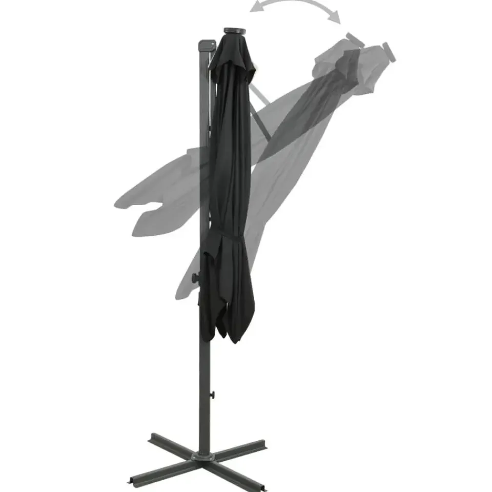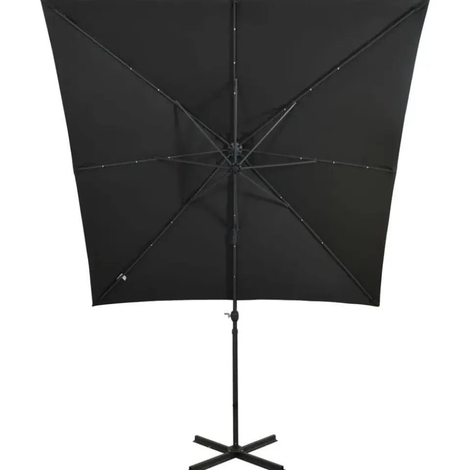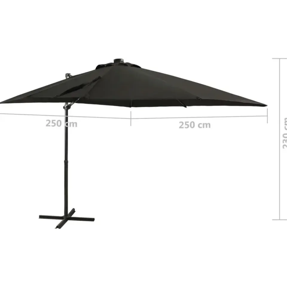 Deze elegante zweefparasol met LED-verlichting is de perfecte keuze om wat schaduw te creëren en jezelf te beschermen tegen de schadelijke uv-straling van de zon. Wanneer de zon ondergaat, verlichten de LED’s je buitenruimte.