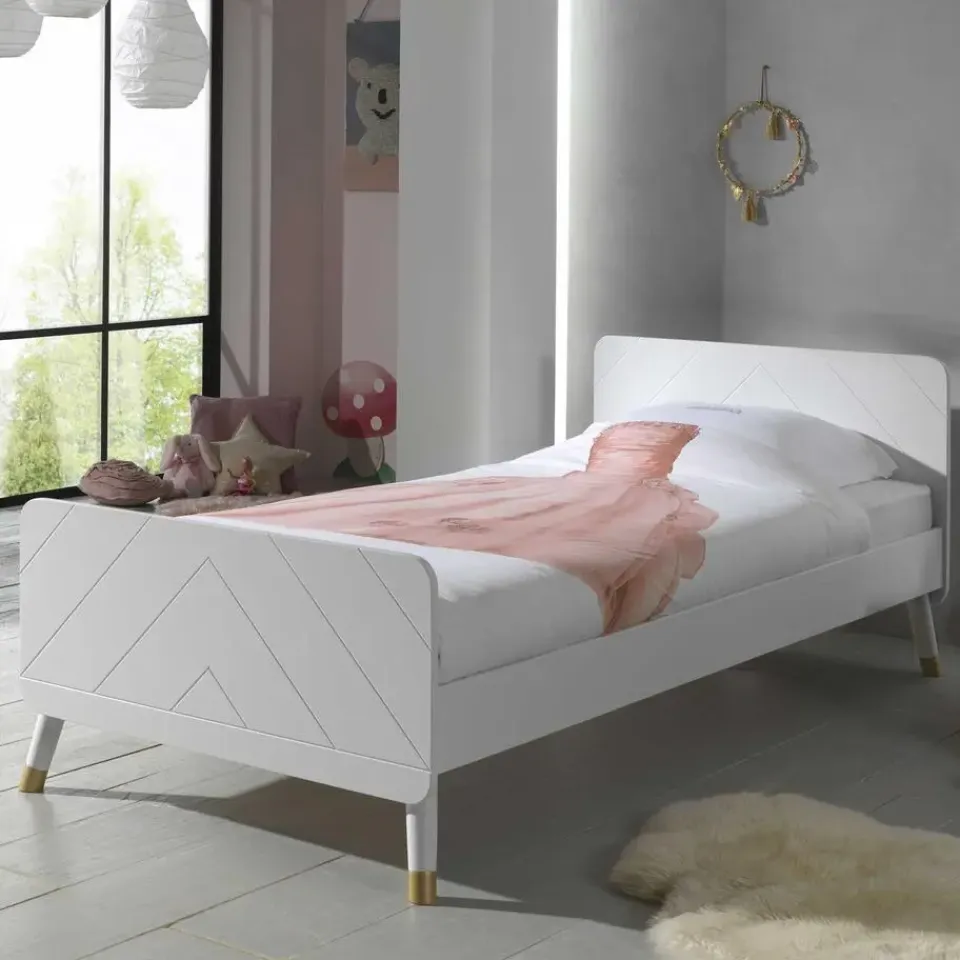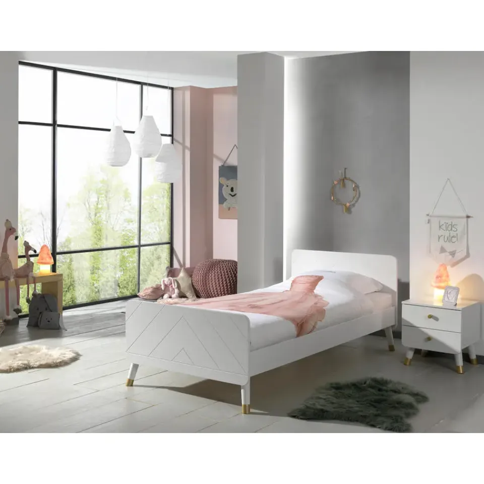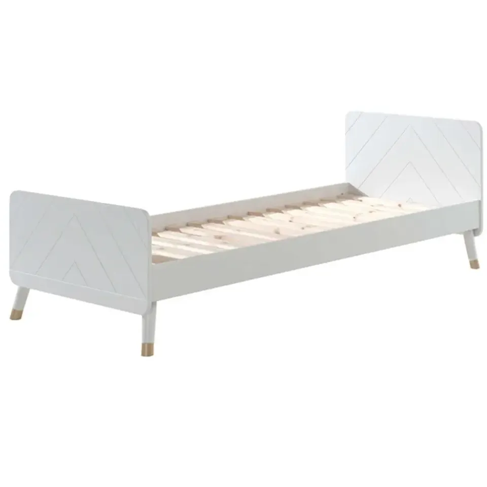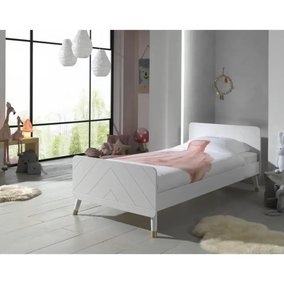 Dit eenpersoonsbed uit de Billy-reeks staat prachtig in elke kinderkamer! Het bed is aan het hoofd- en voetbord versierd met een grafisch patroon, wat het bed een unieke uitstraling geeft. De schuine pootjes met goudkleurig detail benadrukken het retro karakter van het bed. Dit stevige bed is gemaakt van hoogwaardig MDF en is gelakt in het wit.