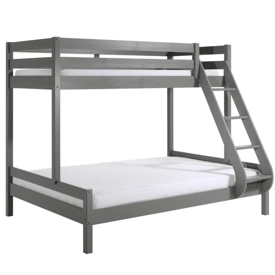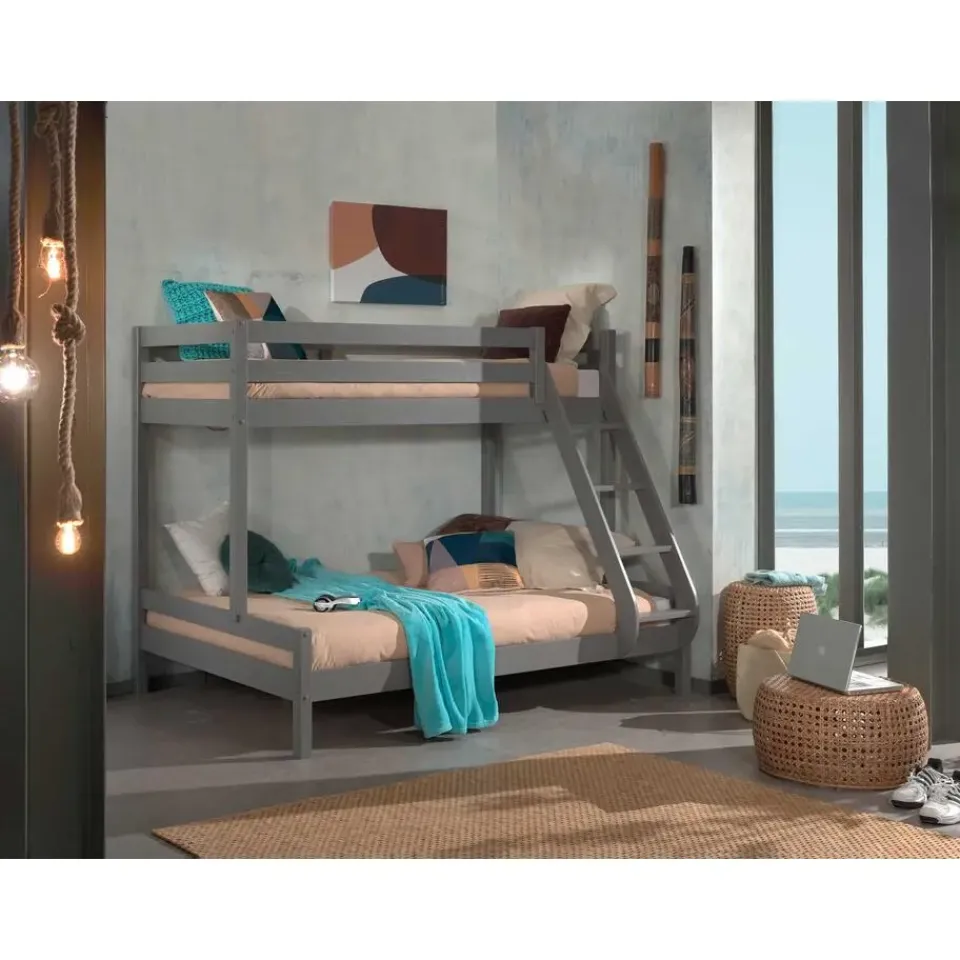 Dit grijze stapelbed is gemaakt van massief den en beschikt over stevige poten van 6,5 x 6,5 cm. De lattenbodems zijn inbegrepen. De lak is op waterbasis en bevat geen schadelijke stoffen.