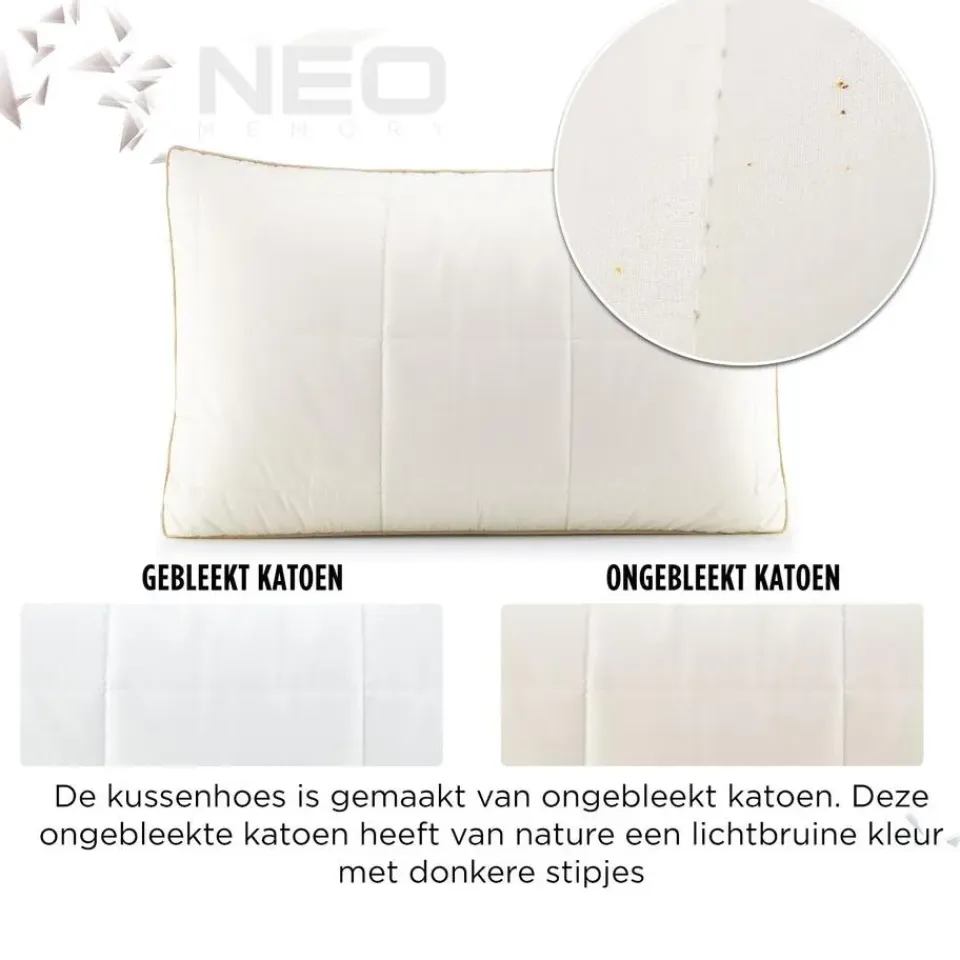 Het kussen heeft twee hoezen: een luchtdichte binnenhoes die voorkomt dat het kussen doorzakt en hierdoor levenslang de juiste vorm behoudt. En een buitenhoes van ongebleekt katoen met ingenaaide bamboevezels van 100% natuurlijke materialen. Dit is delicater en volkomen ongevaarlijk in vergelijking met de traditionele katoenen stof. De hoes is namelijk aangenaam voor de tere huid en veroorzaakt geen allergische reacties. U herkent ongebleekt katoen aan de kleine zwarte puntjes die het natuurlijke uiterlijk kenmerken.