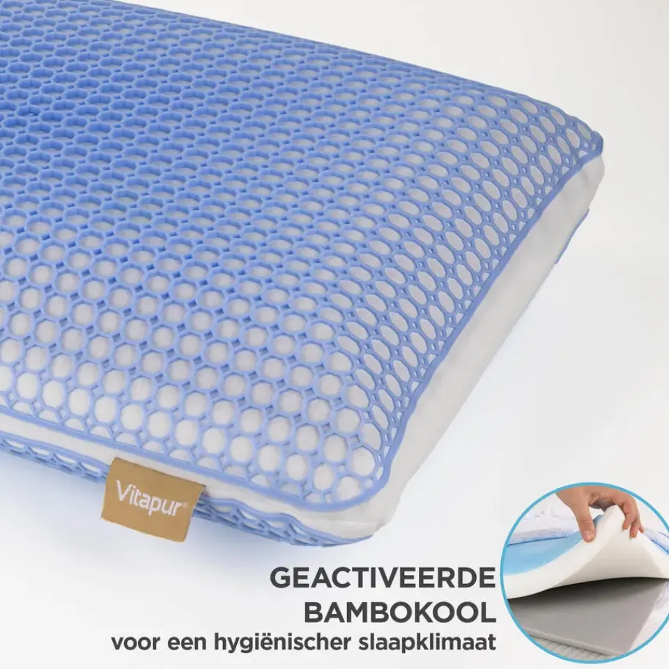 Dankzij de netstructuur is het innovatieve MemoGel-materiaal tot 50% beter ademend en biedt het tot 25% betere ondersteuning dan standaard traagschuim. Het past zich tijdens de slaap voortdurend aan je hoofdpositie aan en ontlast de nekspieren voor ultiem comfort. Het materiaal is aangenaam zacht en voelt koel aan.