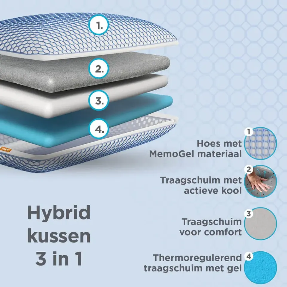 - 3-in-1 hybride traagschuimkussen: Drie functionele lagen traagschuim voor optimale ondersteuning, temperatuurregulatie en een fris gevoel.