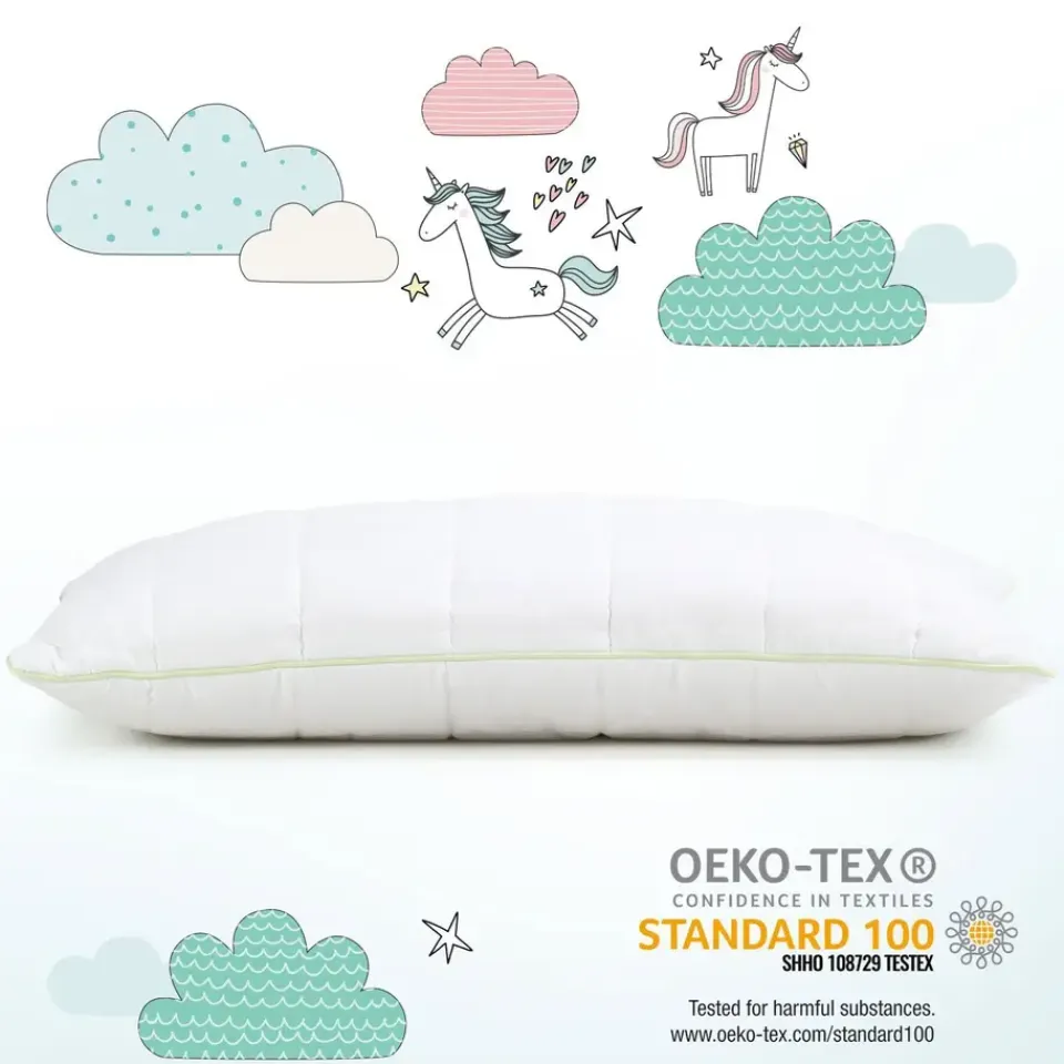 Wij geven om de materialen waar kinderen op slapen. Al onze kussens zijn gemaakt zonder schadelijke chemicaliën zoals OEKO-TEX Standard 100 aantoont. De vulling biedt dezelfde zachtheid als dons maar zonder allergieën te veroorzaken.