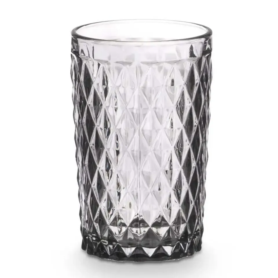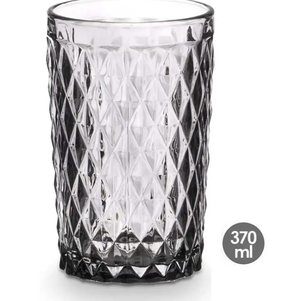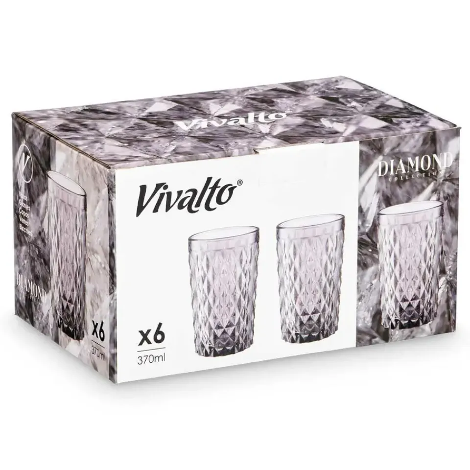 Vivalto drinkglazen/waterglazen Diamonds tumblers, set van 6x stuks, met een inhoud van ca. 370 ml. Luxe glazen in het grijs transparant. Deze drinkglazen zijn geschikt voor de vaatwasser. Materiaal: grijs glas. Afmeting per grijs glas: 8 x 12 cm. Drinkglazen met een luxe uitstraling door het bewerkte grijs glas.