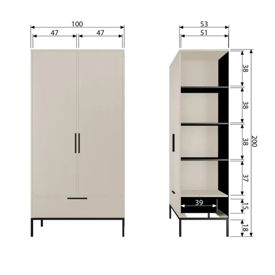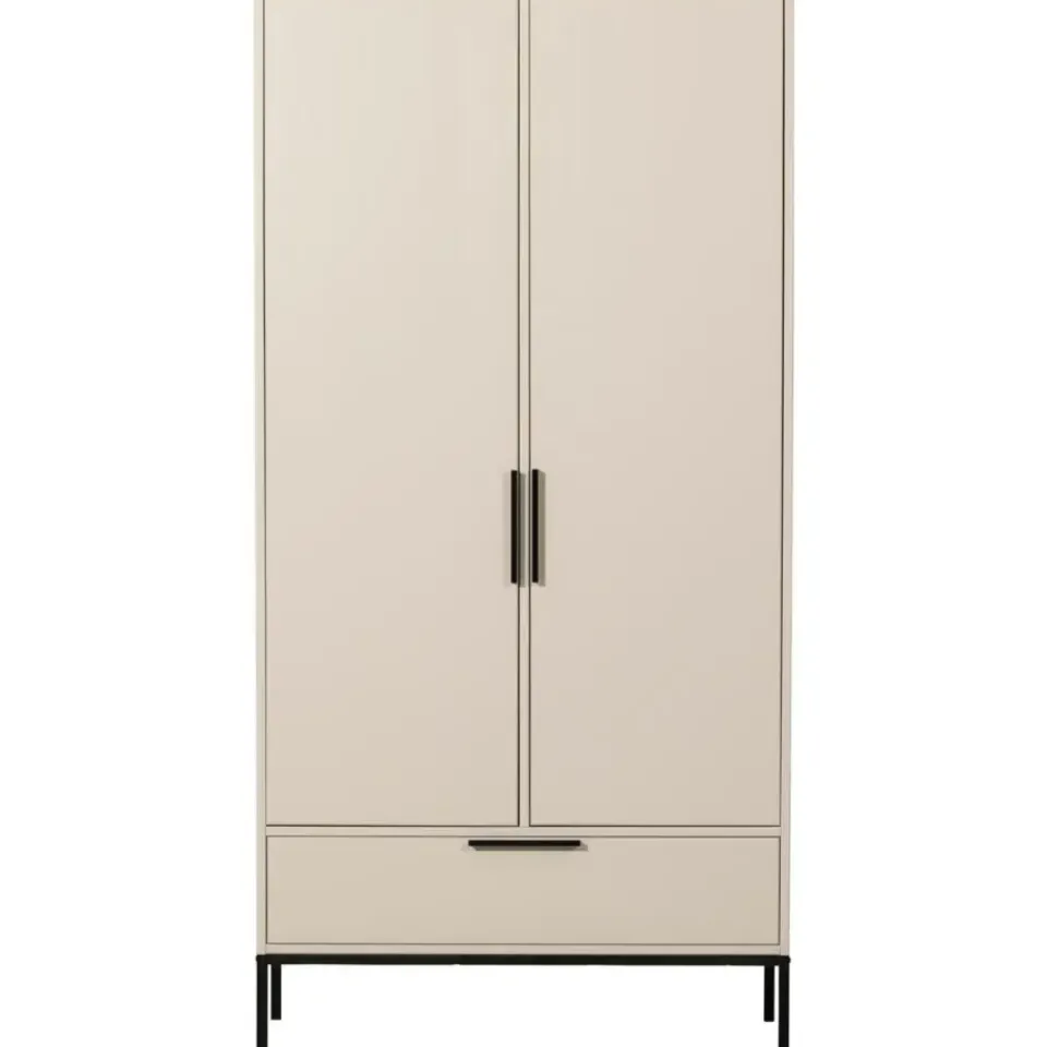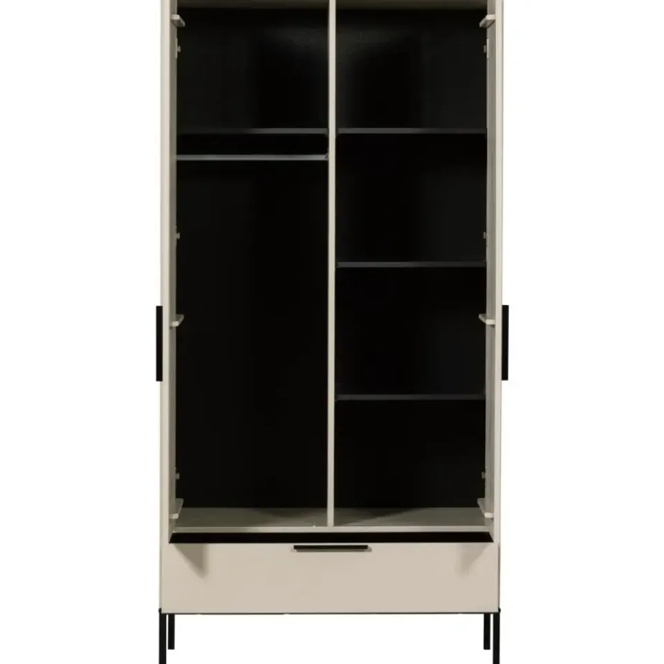 De tweedeurs kast Adam is een Nederlands fabricaat uit de collectie van WOOOD. De kast is gemaakt van massief geschuurd grenenhout wat een robuuste look geeft. Het interieur van de kast is in dezelfde kleur als de kast gespoten en bestaat uit links: een hanggedeelte met een roede en een legplank, en rechts: 3 legplanken. De legplanken zijn gemaakt van spaanplaat. Onder deze deuren zit een brede treklade. Zowel de handvaten van de deuren en de lade evenals de poten zijn stijlvol afgewerkt met een mat zwarte poedercoating.