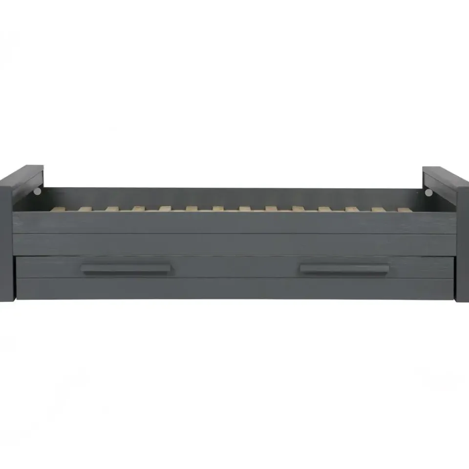 WOOOD Dennis Bed incl. matras/bedlade 219x53x95 (bxhxd) is een moderne en stoere bed voor een kinder- en tienerslaapkamer. Het Dennis bed incl. matras/bedlade is voor één-persoon en komt uit de collectie van het Nederlandse merk WOOOD. Het bed en matras/bedlade zijn gemaakt van grenenhout met een staal grijze finish en heeft een geborstelde afwerking waardoor het bed een éxtra robuuste en stoere uitstraling krijgt. De matras/bedlade wordt standaard geleverd als opberglade, maar wanneer er een lattenbodem met lint (90×200) en een matras (90x190x12) wordt toegevoegd kan de lade ook worden gebruikt als logeerbed. De Dennis bedbank wordt exclusief matras (90×200) en inclusief lattenbodem geleverd.