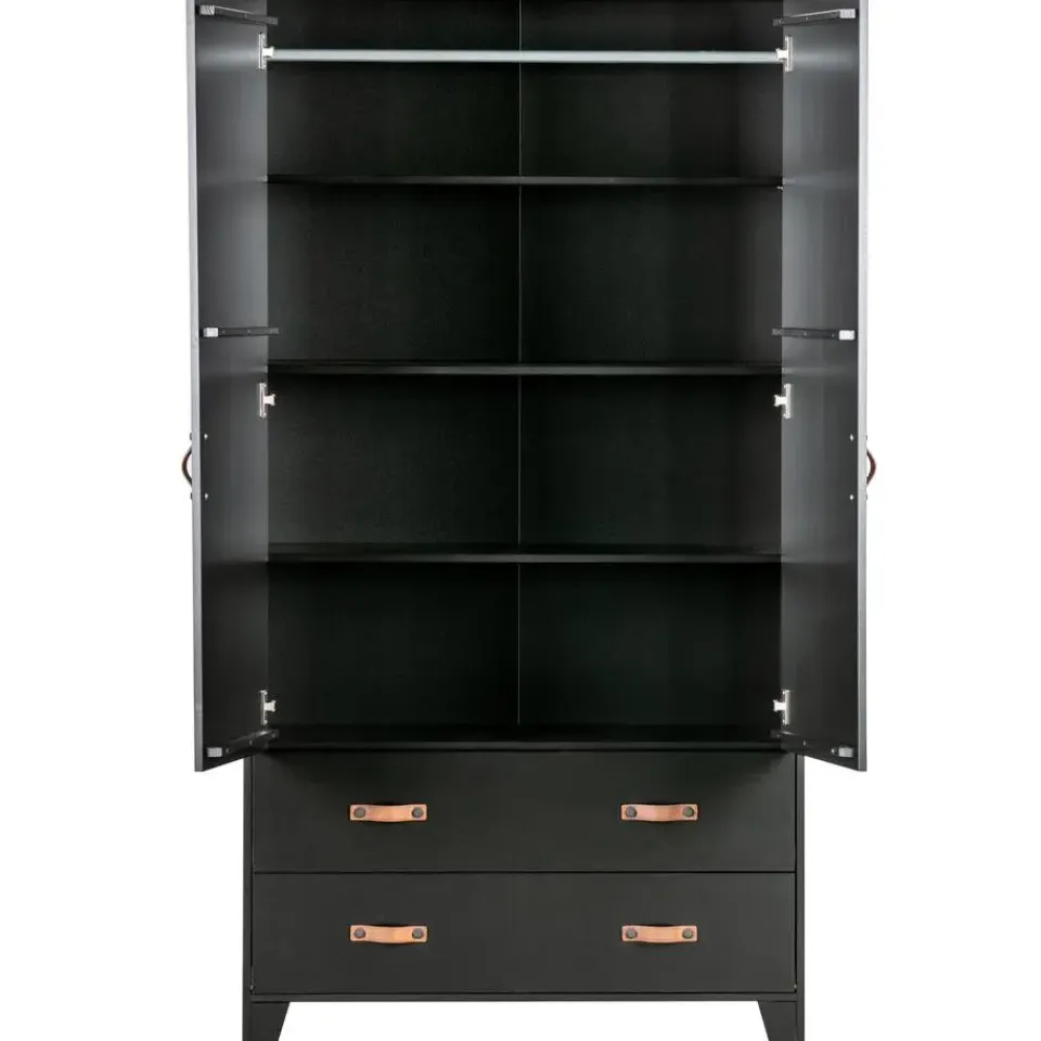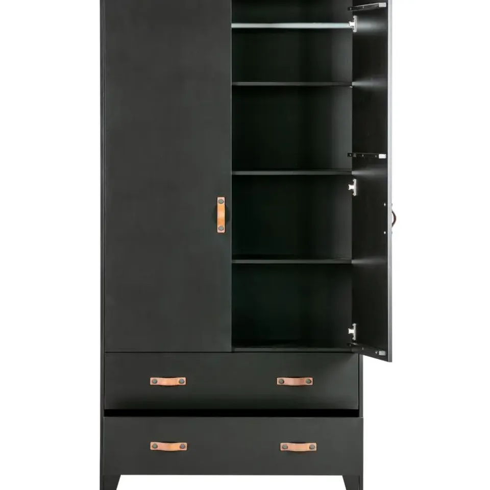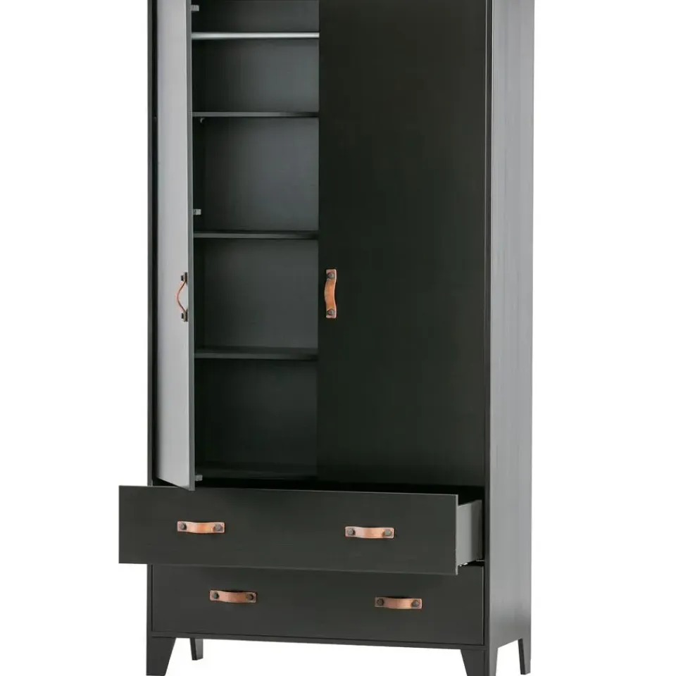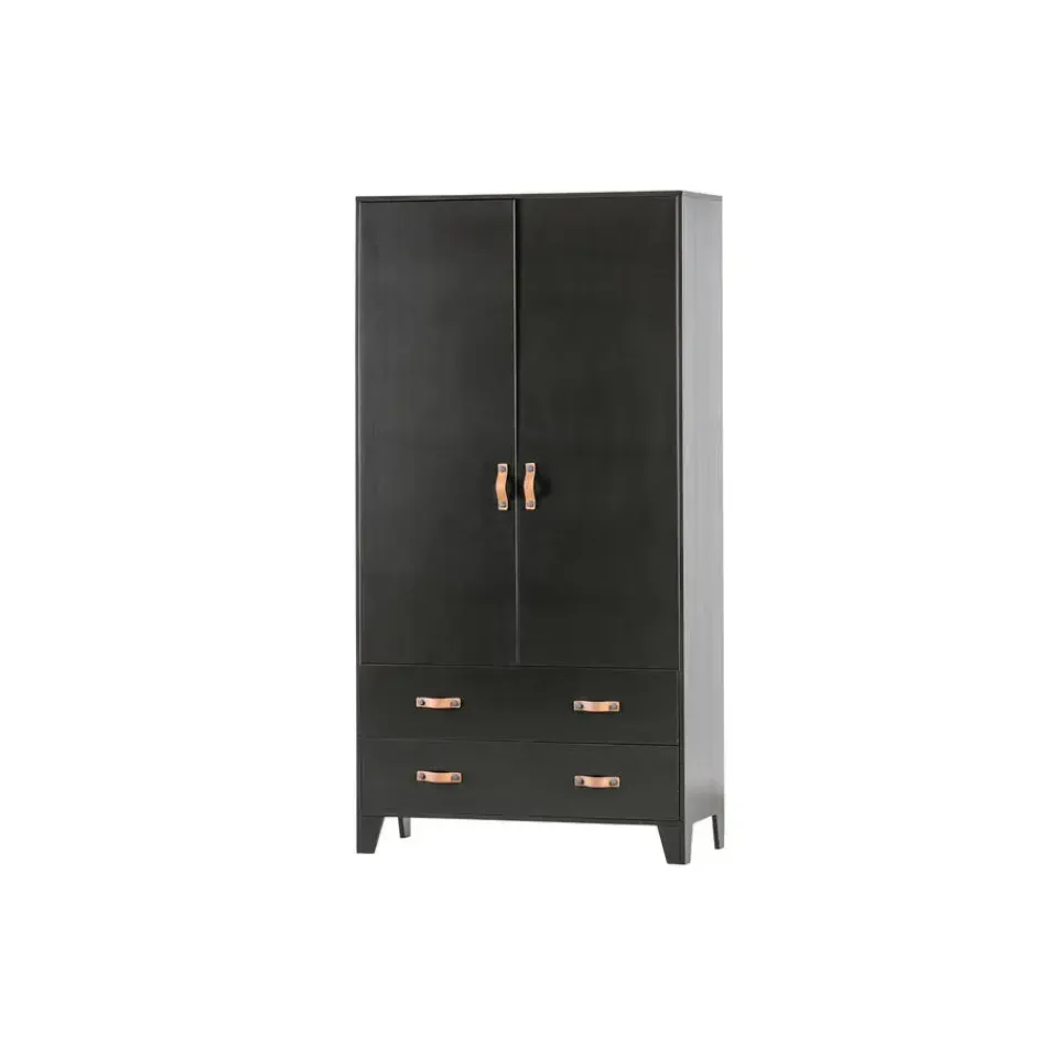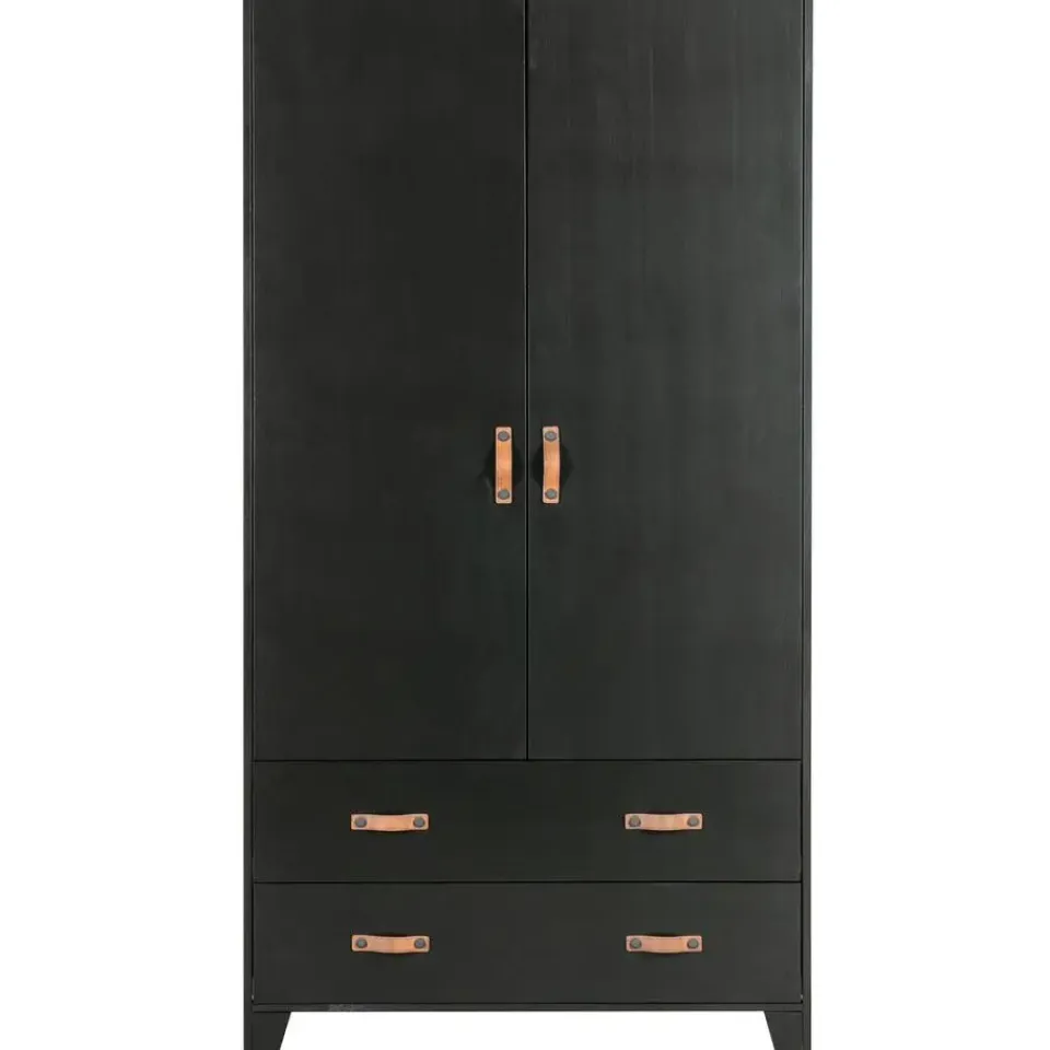 Deze Dian garderobekast is eigentijds, basic en een tikkeltje stoer. Dian is een eigen ontwerp en komt uit de collectie van het merk WOOOD. De garderobekast is gemaakt van grenen dat is afgewerkt in een stoere zwarte kleur. De kast is voorzien van twee lades met twee leren grepen per lade en twee deuren met een leren greep. Dit zorgt voor genoeg opbergruimte. Door de moderne, stoere uitstraling past deze kast in vele slaapkamers thuis! Apart verkrijgbaar in de Dian serie zijn een bed, bureau of opbergkast om een complete slaapkamer in te richten.