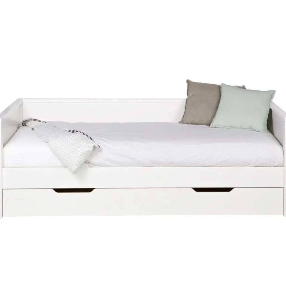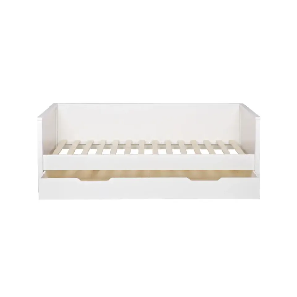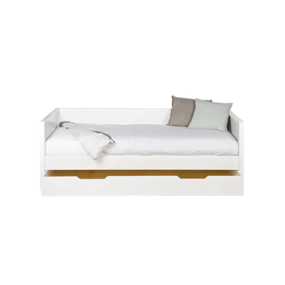 WOOOD Nikki Bedbank incl. bedlade 208x73x100 (bxhxd) is handig voor een kinder- en tienerslaapkamer. Niet alleen om te slapen, maar ook handig bij het gamen óf tv kijken op de slaapkamer. De Nikki bedbank incl. bedlade is voor één-persoon en komt uit de collectie van het Nederlandse merk WOOOD. De bedbank incl. bedlade is gemaakt van grenenhout met een witte finish en heeft een geborstelde afwerking waardoor het bed een éxtra robuuste en stoere uitstraling krijgt. De bedlade wordt standaard geleverd als opberglade, maar wanneer er een lattenbodem met lint (90×200) en een matras (90x190x11) wordt toegevoegd kan de lade ook worden gebruikt als logeerbed. De Nikki bedbank wordt exclusief matras (90×200) en inclusief lattenbodem geleverd.