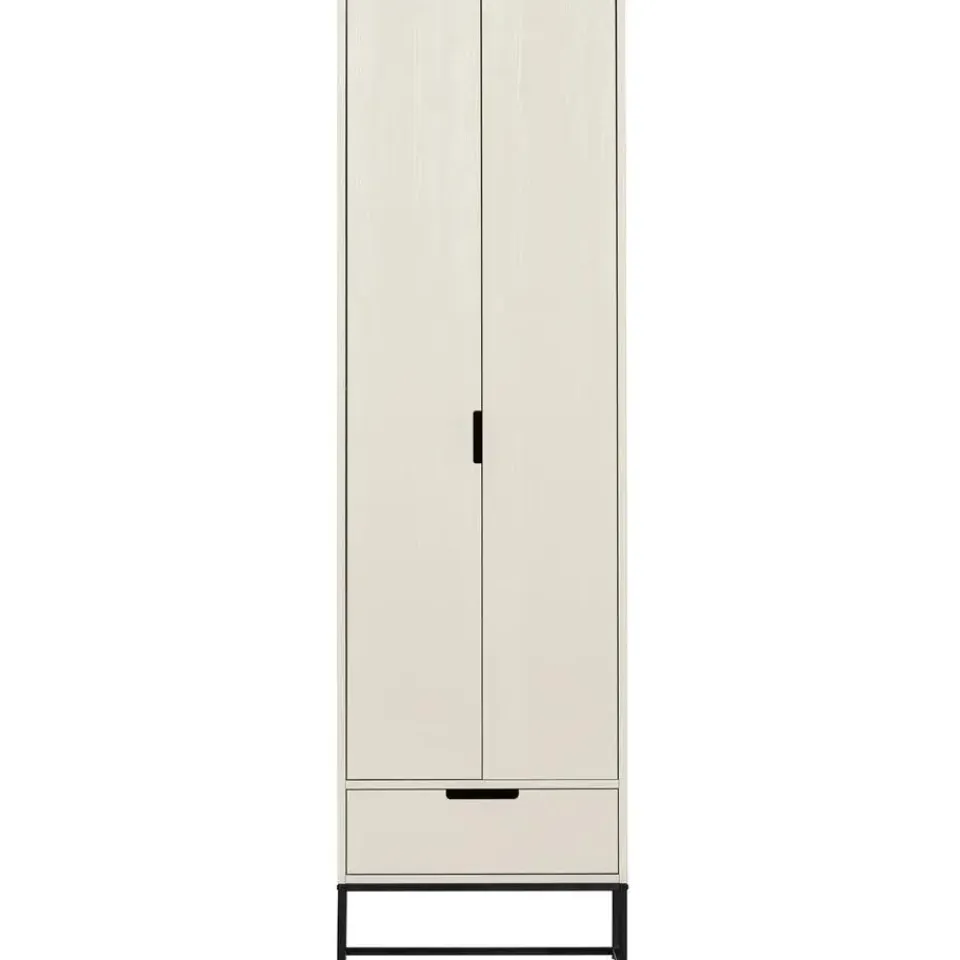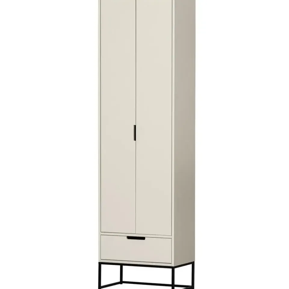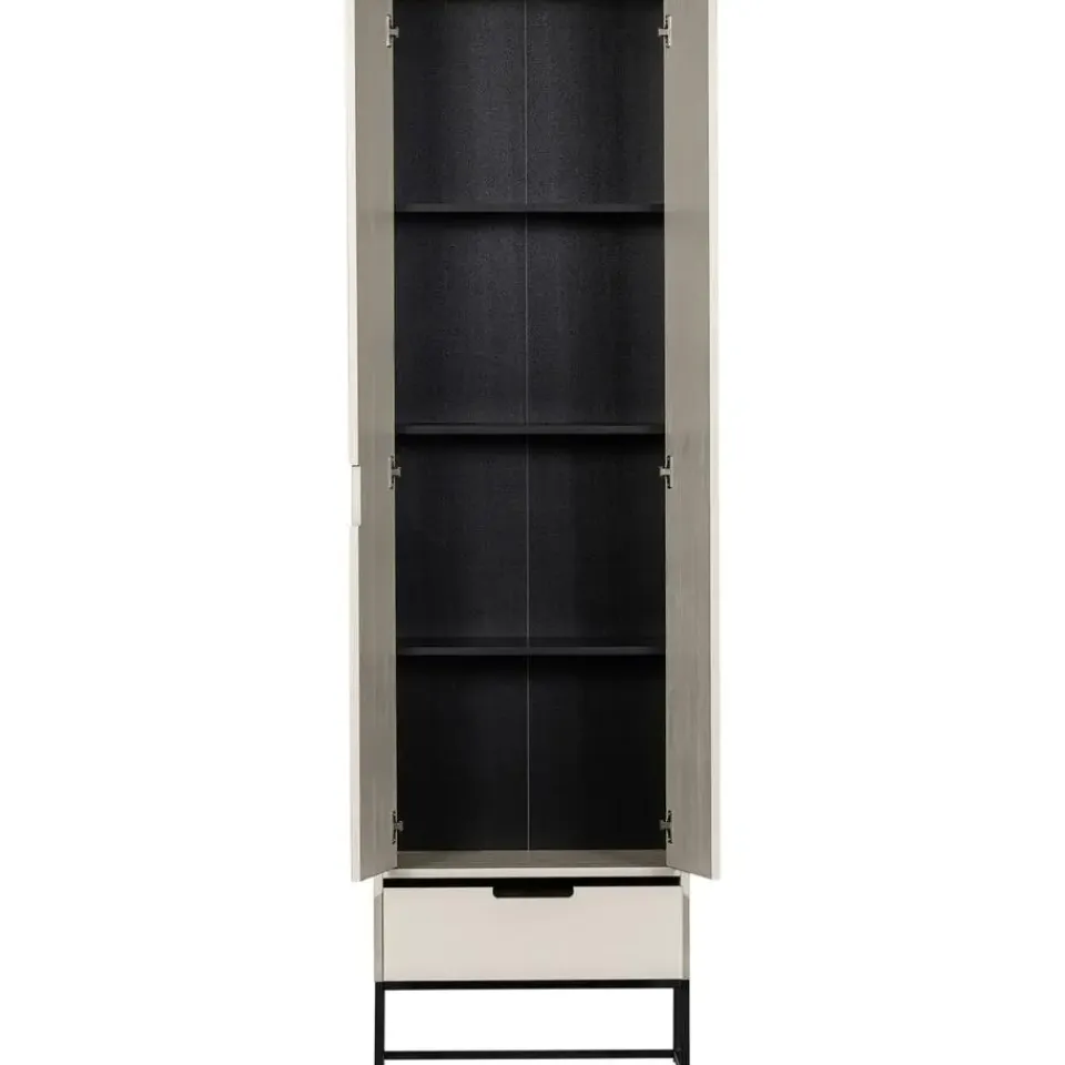 Deze hoge kast met twee deuren en lade is gemaakt van grenenhout, heeft een geschuurde afwerking en is afgelakt in de kleur dust. Het onderstel is van zwart metaal. De grenenhouten meubelen uit onze collecties zijn afkomstig van FSC-gecertificeerde leveranciers en worden op diverse manieren behandeld. Zo is geschuurd grenen zeer glad en netjes en staat geborsteld grenen juist bekend om zijn karakteristieke nerftekeningen en doorleefde uitstraling. Voor een nog robuustere look wordt het grenenhout band gezaagd. Grenenhout wordt gekenmerkt door een lichtgele kleur en zichtbare vlamtekeningen.