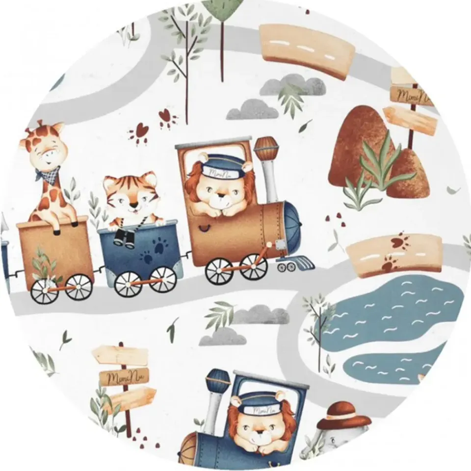Dit dessin heeft een speelse en avontuurlijke uitstraling, perfect voor een kinderkamer. Het patroon toont een vrolijke treintje dat over een kronkelend spoor rijdt door een landschap met bomen, struiken, vijvers en bruggetjes. In de treinwagons zitten schattige dieren, zoals een olifant en een tijger, die een gezellige en fantasierijke sfeer creëren. De kleuren zijn warm en natuurlijk, met tinten van blauw, groen, bruin en oranje, wat het dessin een zachte en harmonieuze uitstraling geeft. Dit dekbedovertrek is ideaal voor kleine treinliefhebbers en dierenfans!