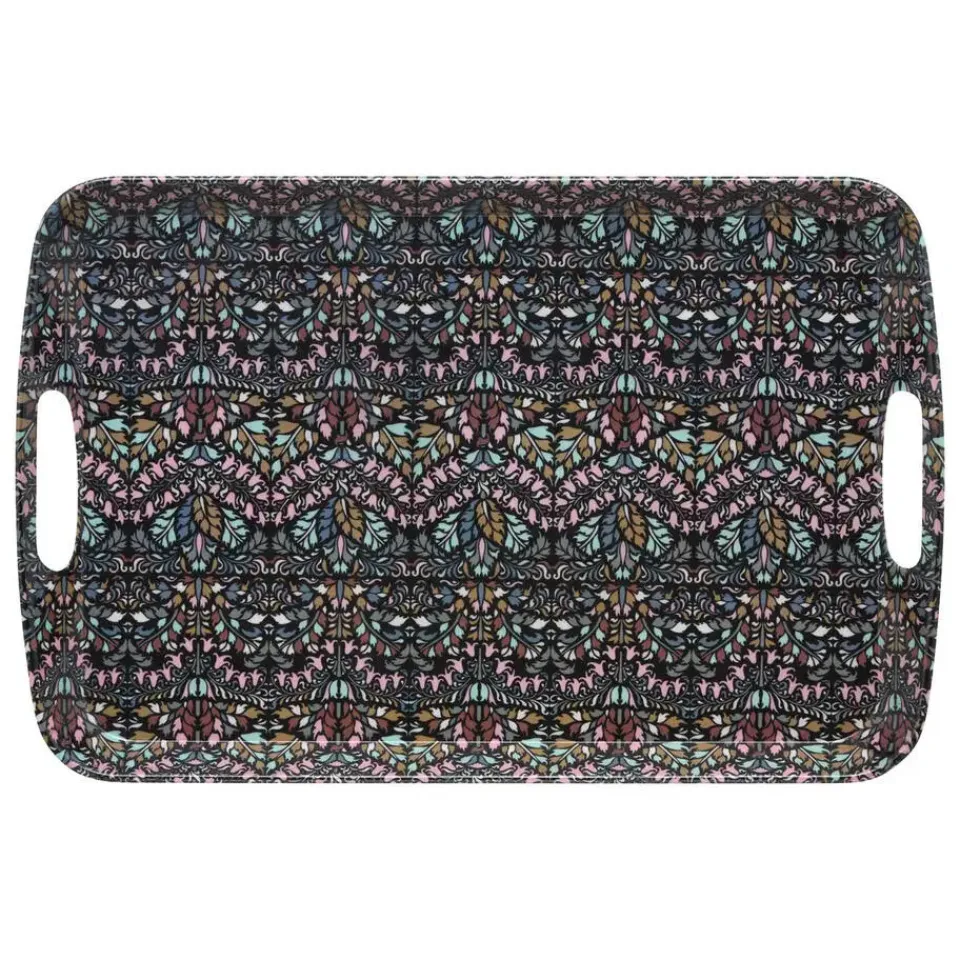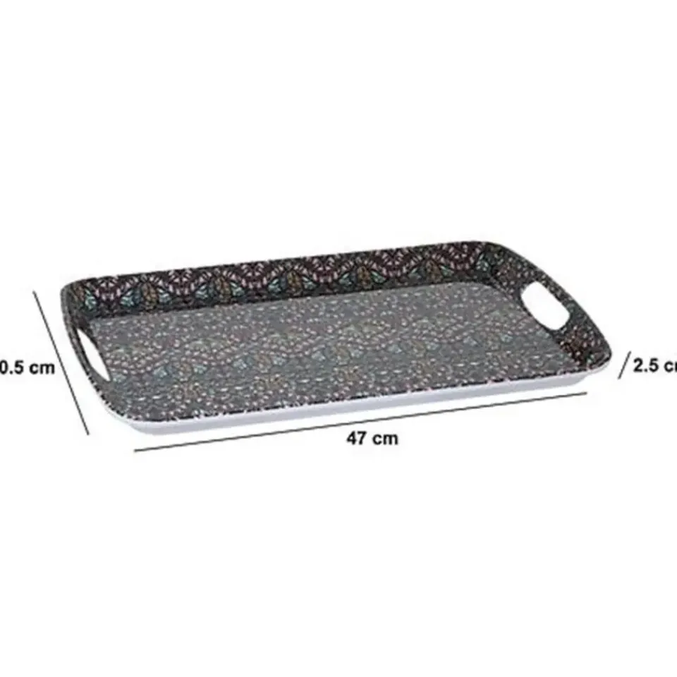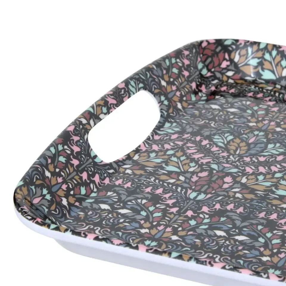 Design serveer dienblad met opstaande rand van 2 cm voor glazen en kopjes. Materiaal: melamine. Print: Flowers. Afmetingen: 47 x 30 x 2 cm. Gebruik het dienblad voor het serveren van koffie, thee, gebakjes, ontbijt, noem maar op. Deze karaktervolle, maar vooral ook handige ruime serveertray is overal voor te gebruiken. Kleur: antraciet als basis kleur.