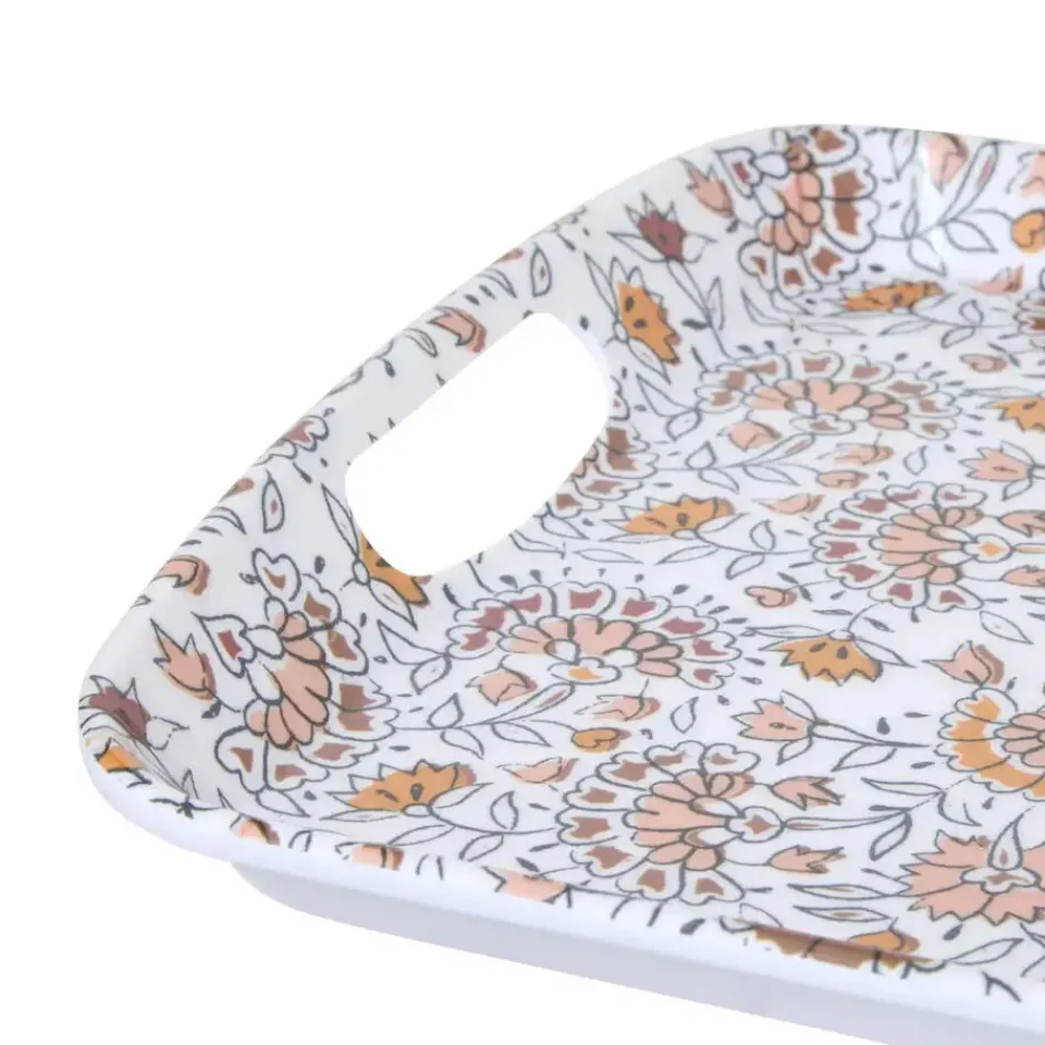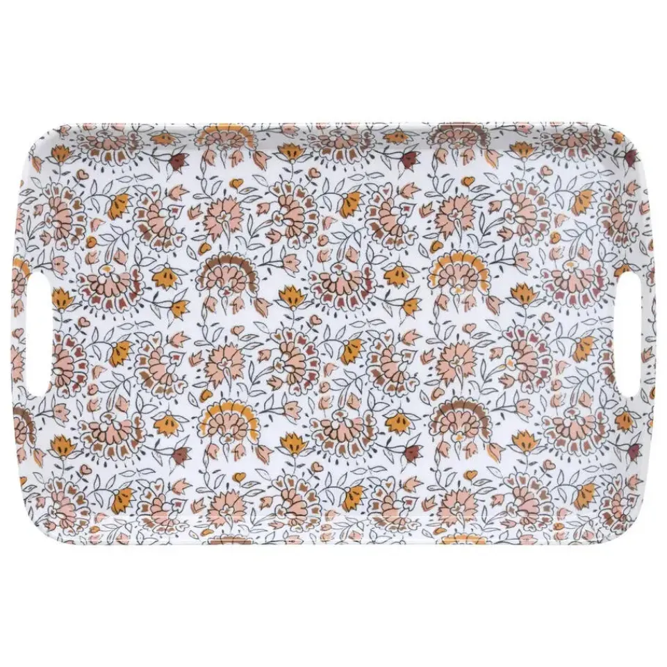 Design serveer dienblad met opstaande rand van 2 cm voor glazen en kopjes. Materiaal: melamine. Print: Flowers. Afmetingen: 47 x 30 x 2 cm. Gebruik het dienblad voor het serveren van koffie, thee, gebakjes, ontbijt, noem maar op. Deze karaktervolle, maar vooral ook handige ruime serveertray is overal voor te gebruiken. Kleur: wit als basis kleur.