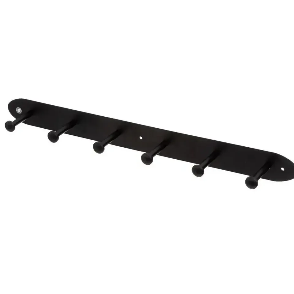 Kapstok rek voor aan de muur/wand in de kleur zwart. Ideaal om je jassen, kleding en/of hoofddeksels aan op te hangen, dankzij de 6x stuks ophanghaken / knoppen is er genoeg ruimte om diverse stukken op te hangen. Afmeting: B55 x H5 cm. Materiaal: metaal. Wandkapstokken. Merk: 5Five. Home storage artikelen.