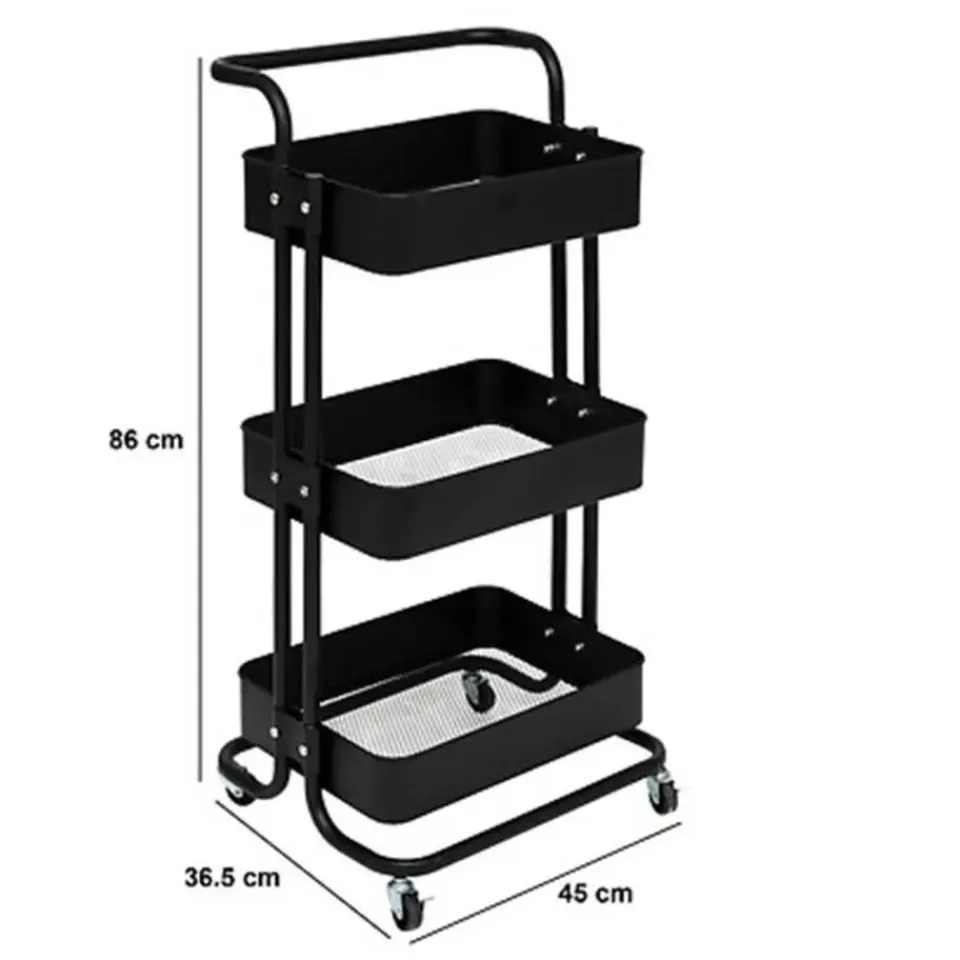 Badkamer en of keuken opberg trolley met 3 lagen en een houten handvat waar je allerlei producten en keukenbenodigdheden in kan bewaren. Je kunt deze trolley ook gebruiken voor in de badkamer om bijv. douchezeep en shampoo in te bewaren. Kortom veel gebruiksmogelijkheden. Deze keukentrolley heeft een formaat van ca. 48 x 41.5 x 87 cm. Materiaal: mesh metaal. Even zelf nog monteren. 2 wielen hebben een rem.