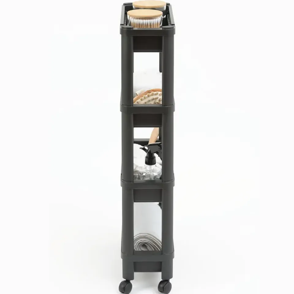 5Five Keuken/badkamer smalle opberg trolley karretje met 4 lagen/bakjes/mandjes. Afmetingen: L37 x B15 x H79 cm. Kleur: zwart. Materiaal: PP kunststof. Deze trolley is makkelijk uitneembaar(kliksysteem) zodat het minder ruimte inneemt. Het karretje is voorzien van wielen en heeft 4 mandjes niveaus met opstaande rand. Gebruik de trolley in de keuken of badkamer om spullen op te bergen. Een must-have voor in ieders huishouden.